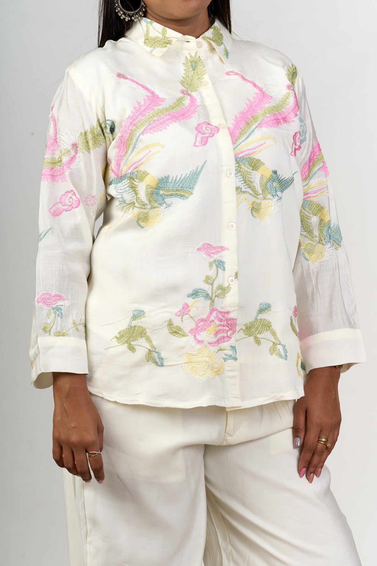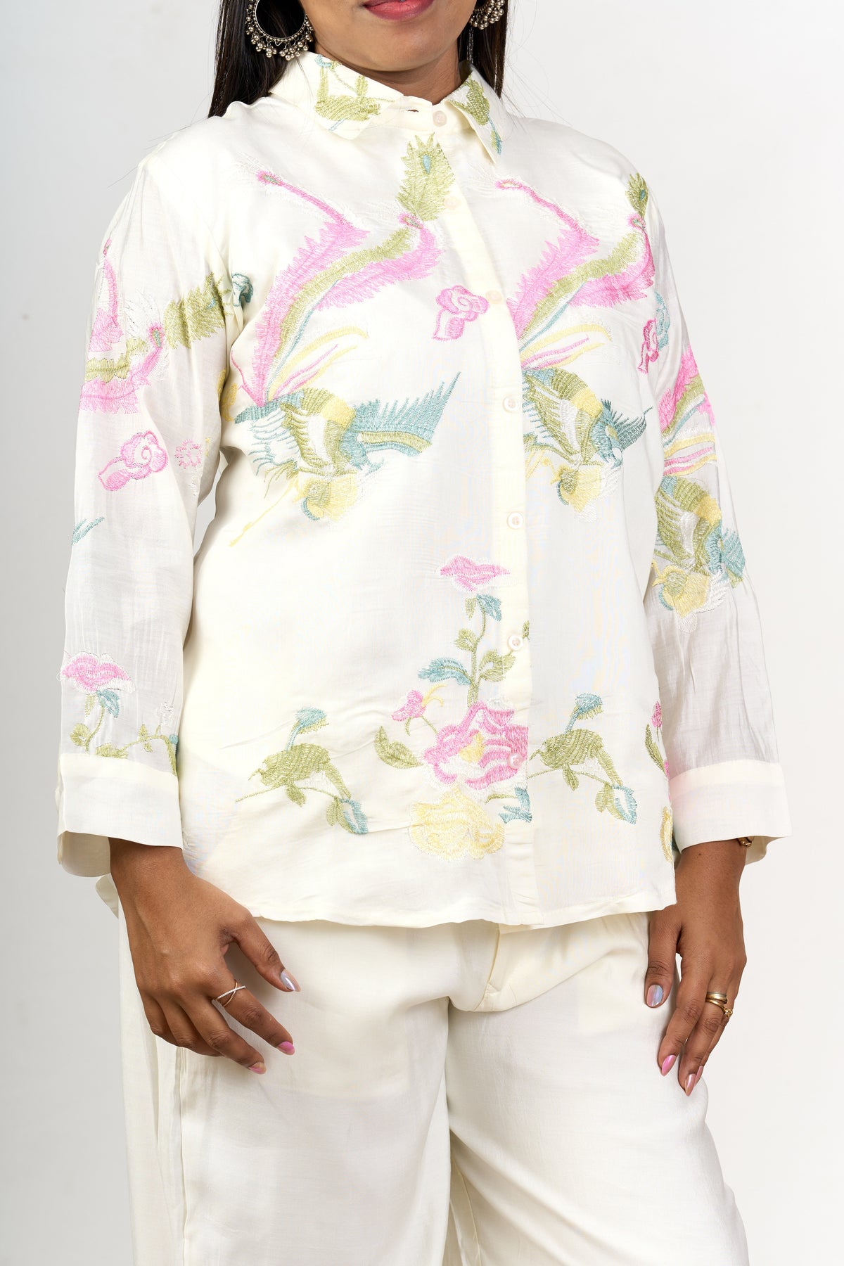 Redefine your style with this timeless two-piece co ord set crafted from premium cotton. Featuring a shirt-style top with delicate pastel floral embroidery, this outfit combines comfort and sophistication. The straight-cut pants add a tailored finish to the ensemble, making it suitable for formal or semi-casual occasions. The subtle embroidered detailing adds a soft feminine touch, while the neutral tones make it easy to accessorize. Pair it with block heels or flats for a versatile look.