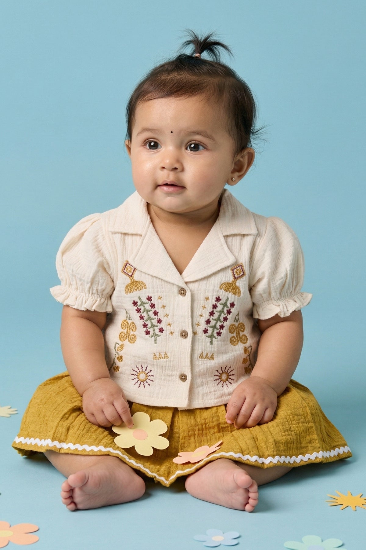 • This baby girl outfit for casual outings is made from crush georgette with delicate thread embroidery