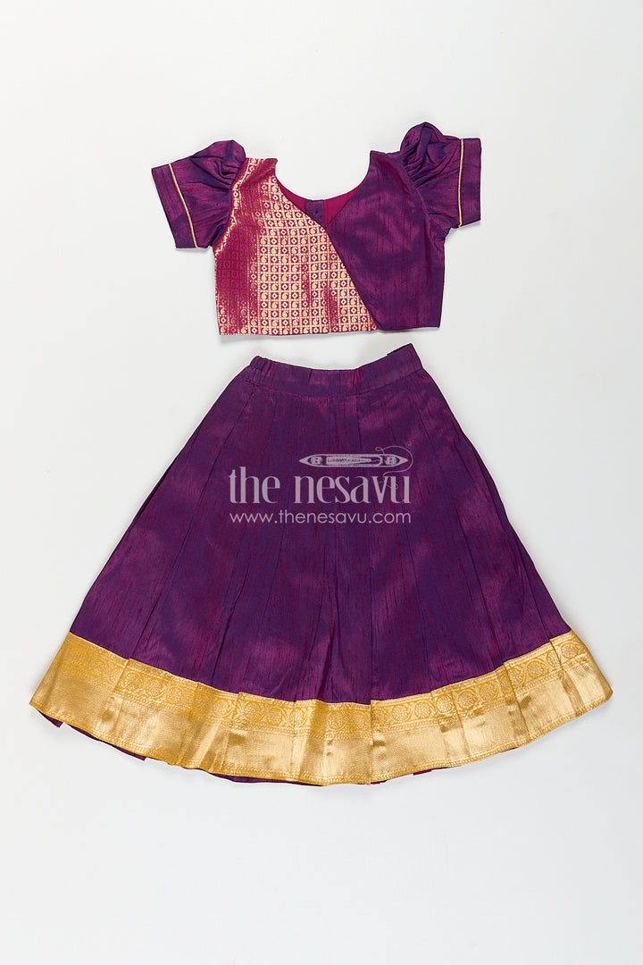 This exquisite silk banarasi lehenga is designed to bring out the grace and charm of your little girl. Crafted from semi banarasi jacquard paired with a raw silk bottom, the ensemble offers a perfect blend of traditional richness and modern sophistication. The deep purple hue accented with a contrasting golden zari border gives it a timeless appeal, while the pleated lehenga allows for ease of movement. The top features structured puff sleeves and a stylish neckline with delicate banarasi motifs, enhancing the ethnic elegance of the outfit. Ideal for any festive moment or cultural celebration, this lehenga ensures both comfort and style with its soft fabric and breathable finish. It's an outfit your child will love to twirl in while feeling absolutely royal.