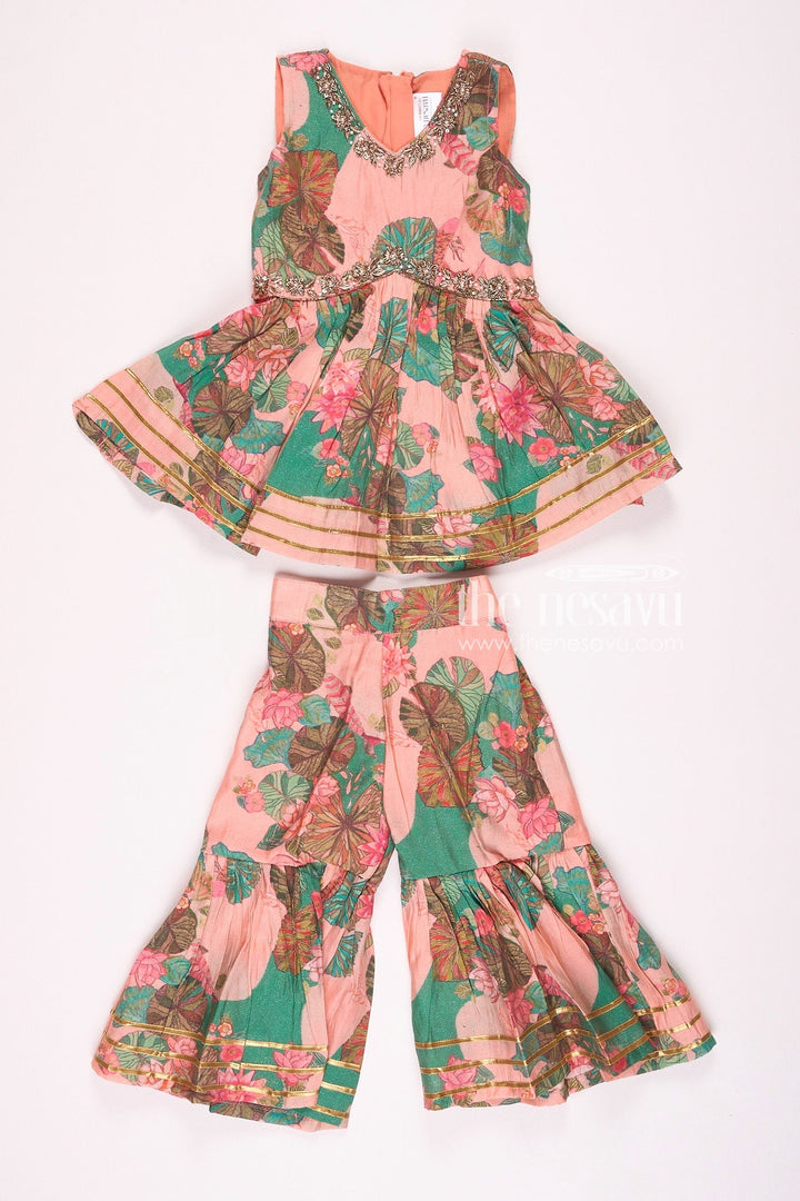 Celebrate Diwali in style with this stunning Nesavu Modal Silk Printed Sharara Plazo Dress, perfect for your little girl. This party wear outfit features a vibrant floral print and intricate hand embroidery, ensuring your child stands out during festive occasions. Available in sizes for girls aged 1 to 10 years, this sharara plazo dress combines elegance with comfort.