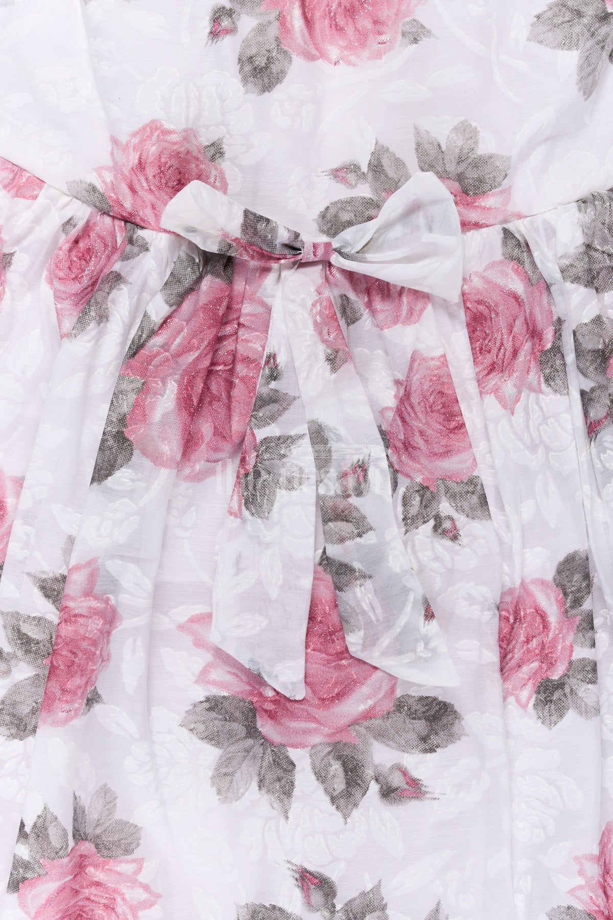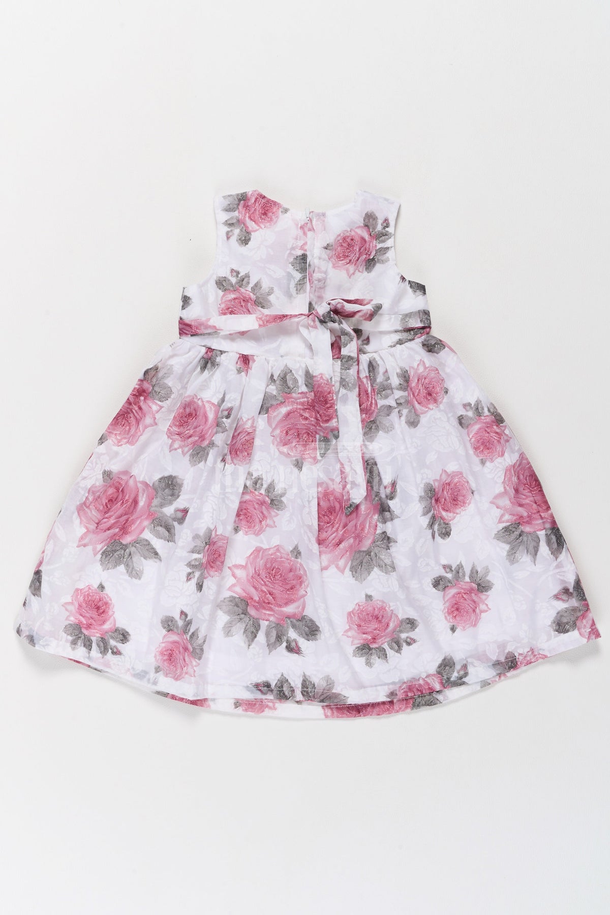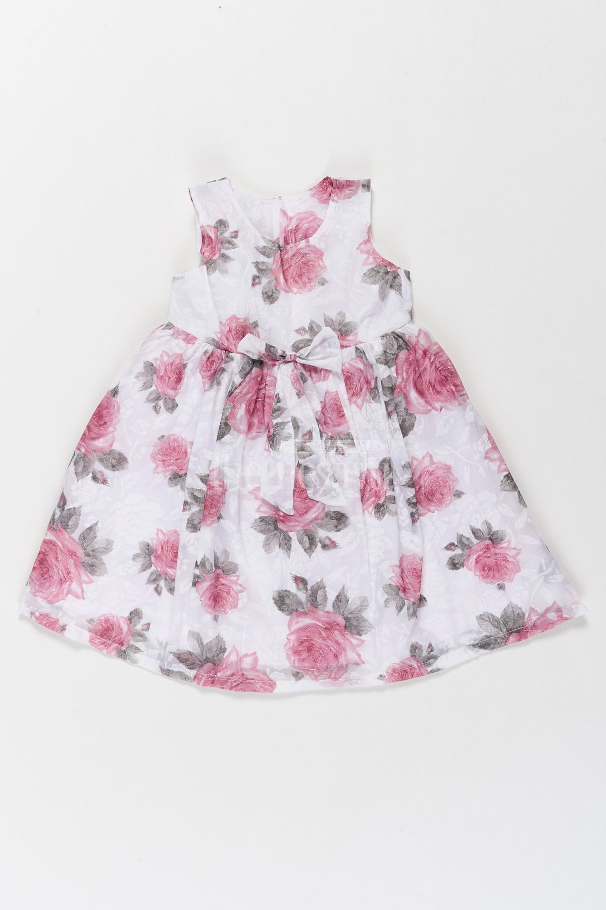 Girls Cotton Frock with Pink Rose Prints and Elegant Bow Accent