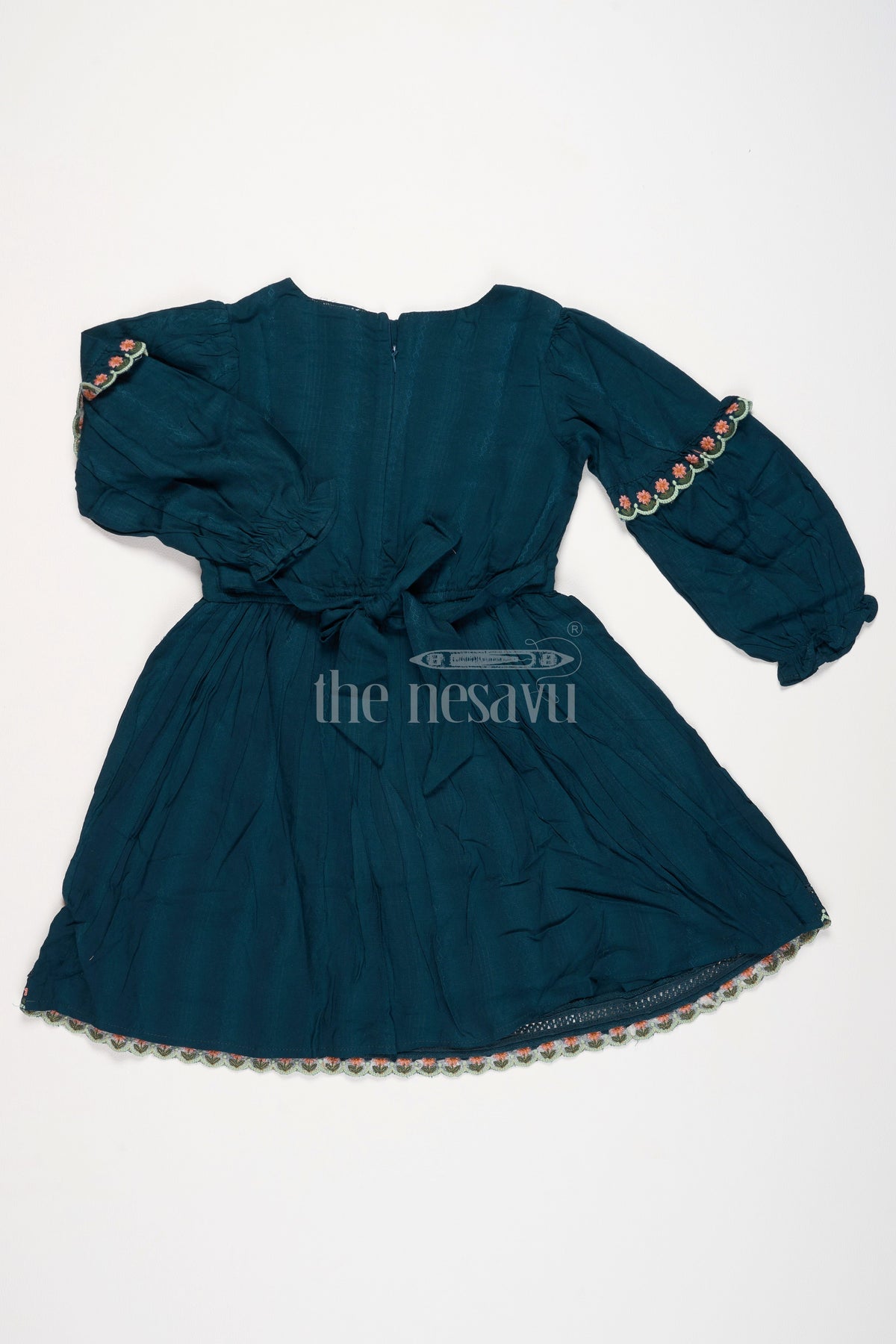 The Nesavu Girls Cotton Frock Girls Green Cotton Frock with Embroidered Bodice and Puff Sleeves in Charming Frock Fancy Design Nesavu 18 (2Y) / Blue GFC1462A-18 Nesavu Girls Green Cotton Frock Puff Sleeves Embroidery Elegant frock fancy design