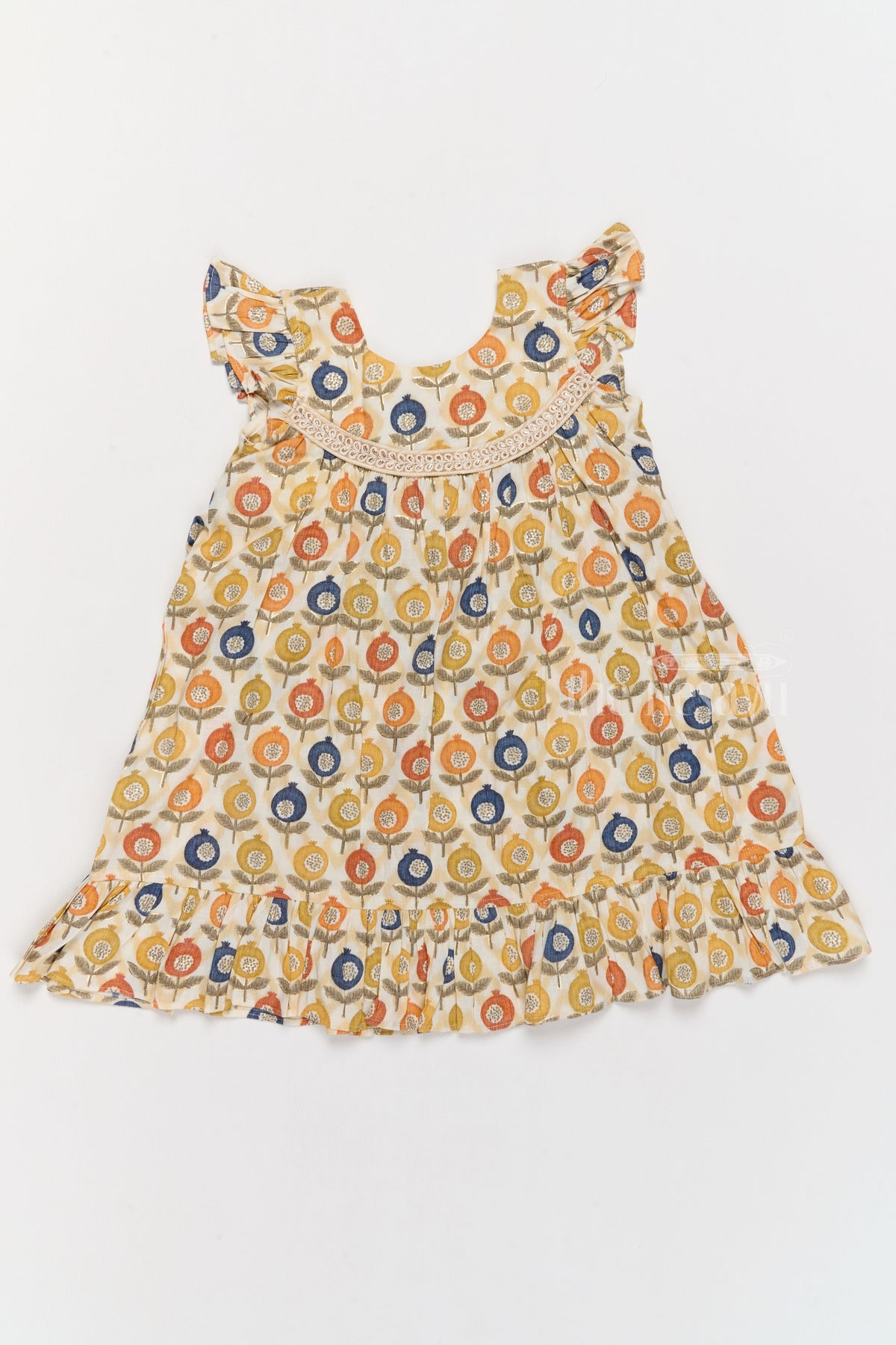 Keep your little one comfortable and stylish every day with this Cotton Daily Wear Dress, crafted for ease and elegance. The soft Rayon fabric features a vibrant floral print in bright shades of yellow and orange, adding a cheerful touch to her daily wardrobe. Designed with flutter sleeves and a ruffled hemline, this dress ensures a playful and charming look. The lace yoke enhances its aesthetic appeal, making it perfect for school events or casual outings. Lightweight and breathable, this dress is ideal for everyday wear, providing the perfect combination of style and practicality.
