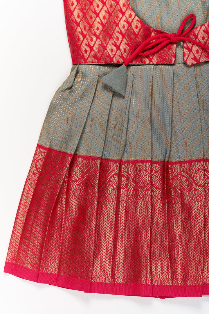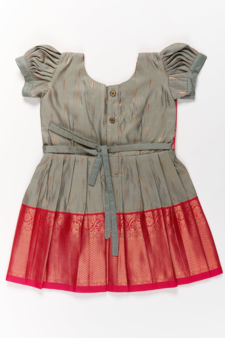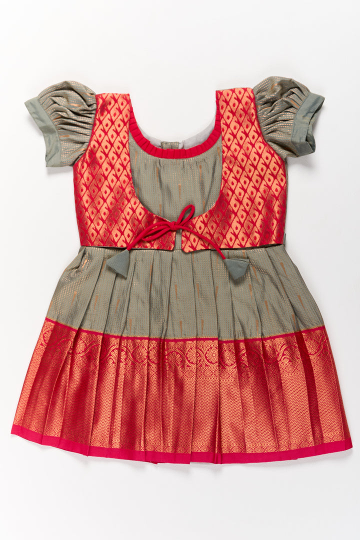 This adorable silk outfit for baby girls is designed to make your little one shine at any festive occasion. Featuring a stunning combination of red and gold brocade with intricate weaving, this outfit exudes elegance. The puff sleeves and pleated skirt add a classic touch, while the tie-up bow detail at the waist enhances its charm. Perfect for traditional celebrations like weddings, birthdays, or festive gatherings, this silk frock ensures comfort and style in equal measure. Its premium silk fabric offers a luxurious feel and ensures a polished, graceful appearance.