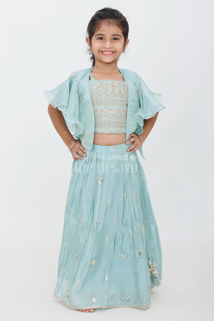 Girls Turquoise Tissue Silk Lehenga Choli with Golden Embroidered Ruffled Jacket and Pleated Skirt