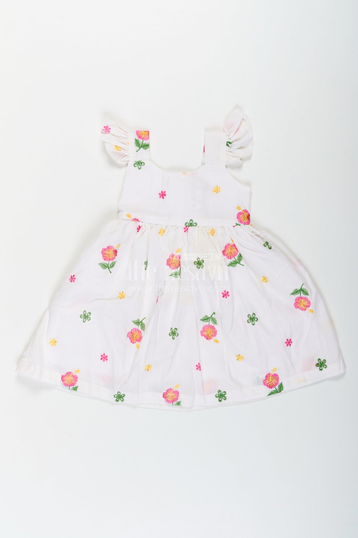 The Nesavu Girls Cotton Frock Girls White Short Frock in Cotton Embroidery with Floral Patterns and Ruffled Sleeves Nesavu Girls White Short Frock Cotton Embroidery Floral Patterns Ruffled Sleeves | The Nesavu
