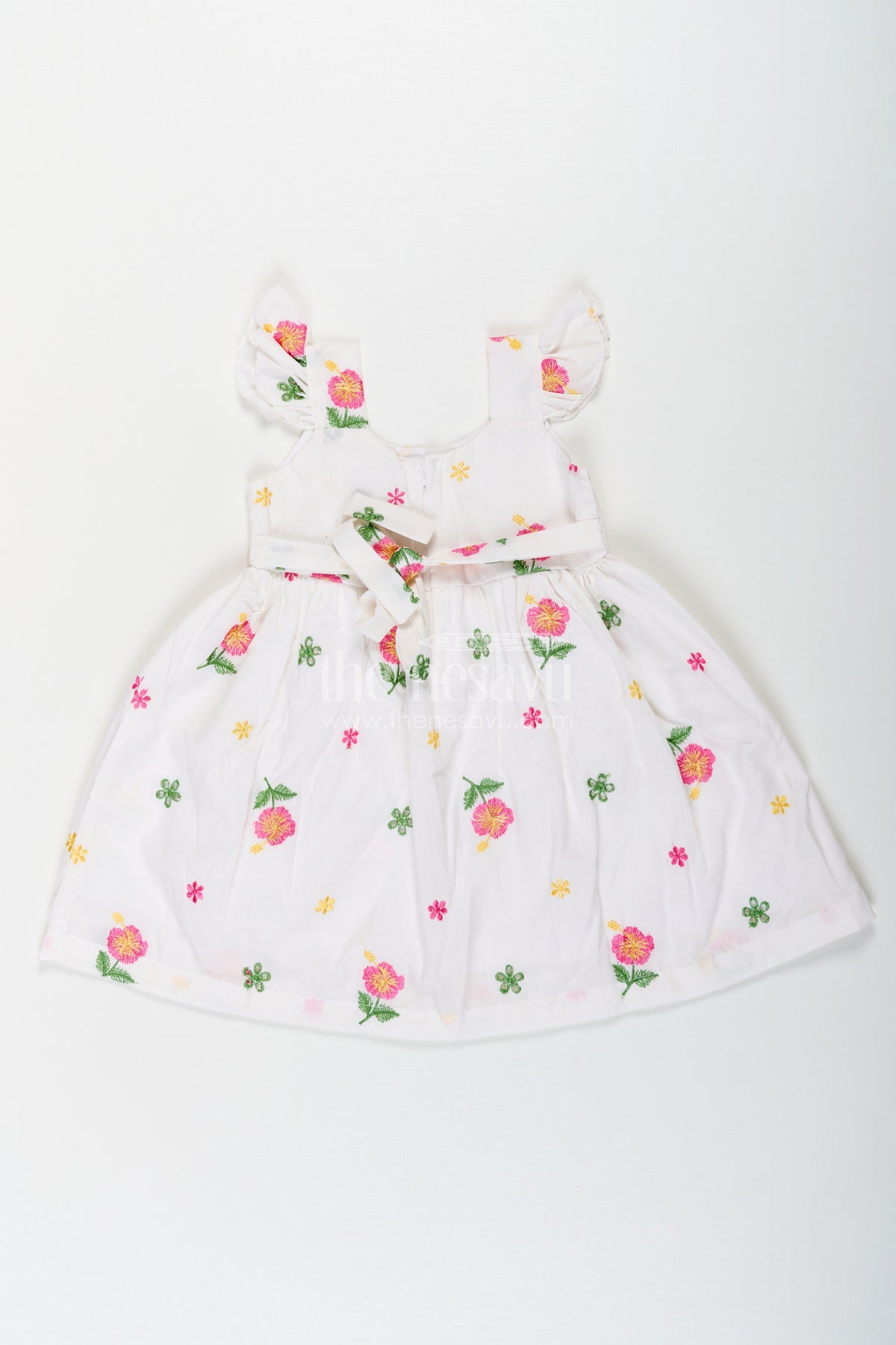 The Nesavu Girls Cotton Frock Girls White Short Frock in Cotton Embroidery with Floral Patterns and Ruffled Sleeves Nesavu Nesavu Girls White Short Frock Cotton Embroidery Floral Patterns Ruffled Sleeves