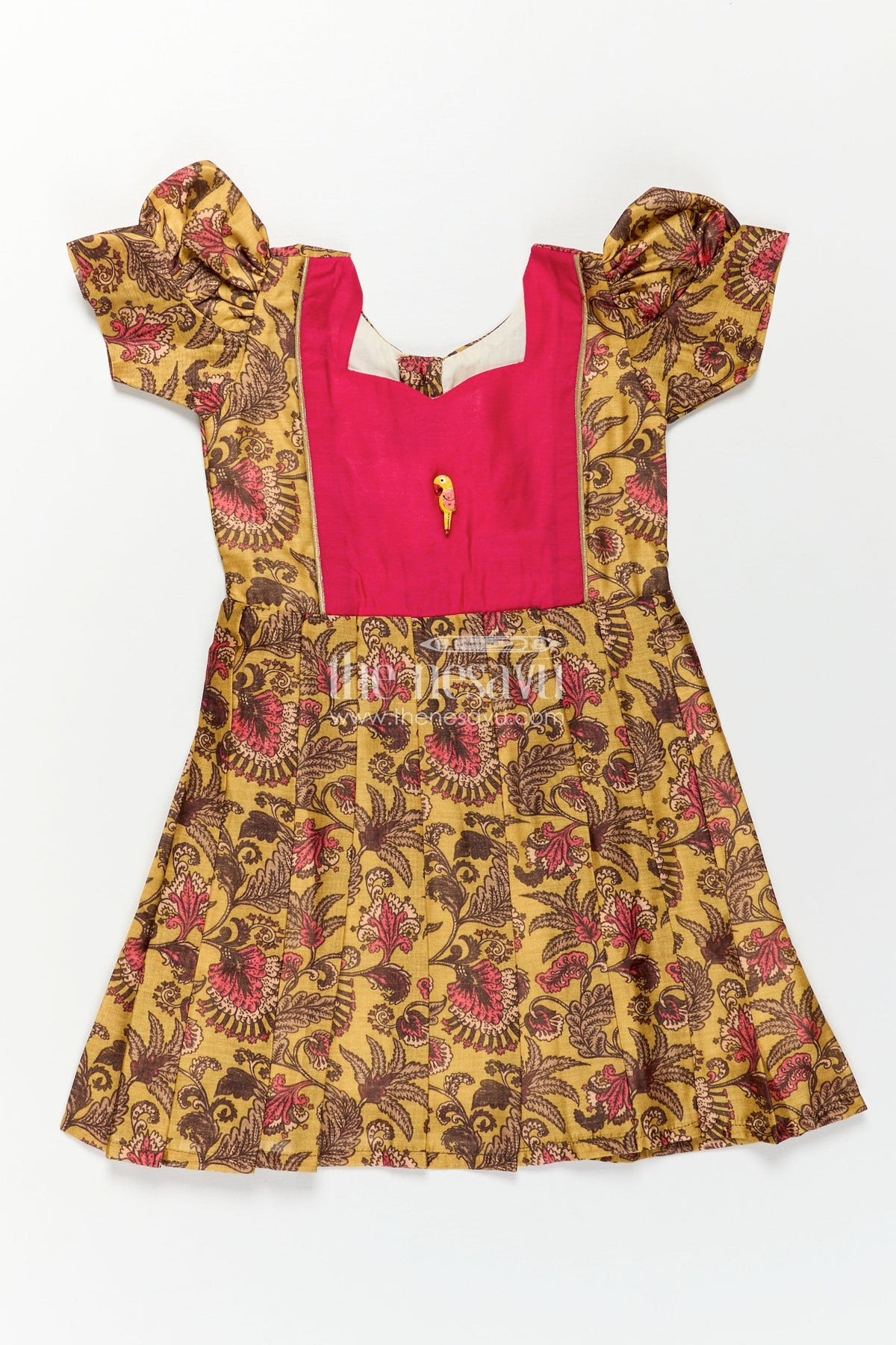 Celebrate cultural grace with this traditional frock design from Nesavu, designed for girls who adore timeless beauty with modern ease. Made from lightweight digital printed Chanderi, the frock features a golden mustard base with rich maroon and brown floral motifs. The bright pink contrast yoke adds vibrancy, while the signature parrot brooch brings playful elegance. Short puff sleeves and wide box pleats provide structure and movement, making it ideal for festive events and traditional family gatherings. Soft, breathable, and detailed with a charming silhouette, this frock brings together comfort and cultural charm effortlessly.