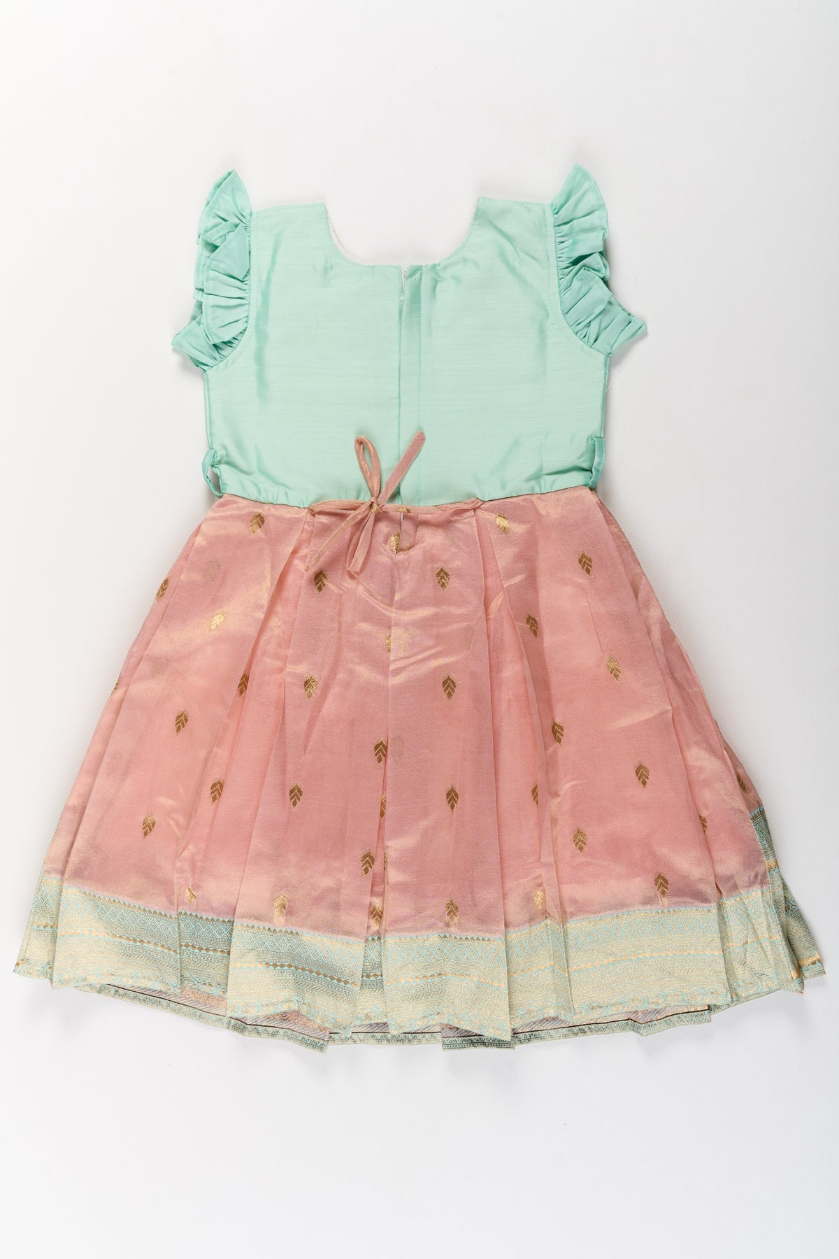 This exquisite silk party frock for girls combines traditional charm with modern design. Crafted from a luxurious blend silk fabric, it features puff sleeves and a beautifully woven zari border, adding an elegant touch to any occasion. The pastel peach and light blue combination enhances its regal appeal, making it perfect for festive celebrations, family events, or weddings. Designed for comfort and style, this frock allows easy movement while maintaining its sophisticated look. The pleated skirt offers a voluminous flair, while the back zip closure ensures hassle-free dressing.