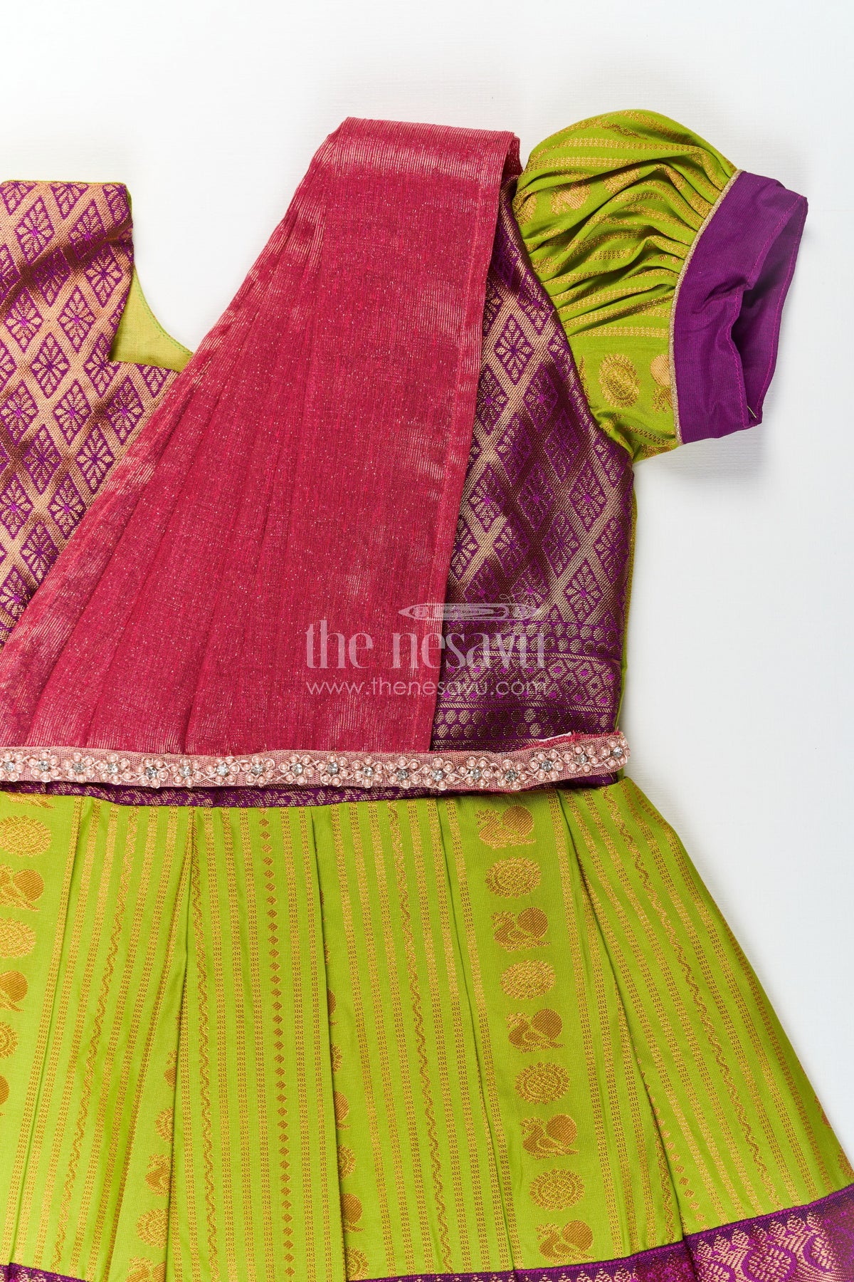 The Nesavu Girls Kanchi Silk Frock Girls Maroon Silk Dress with Semi Kanchivaram Weave and Stone Lace Embellished Dupatta Nesavu 20 (3Y) / Green / Style 3 SF813AC-20 Nesavu Maroon Silk Dress for Girls with Semi Kanchivaram Weave and Embellished Dupatta
