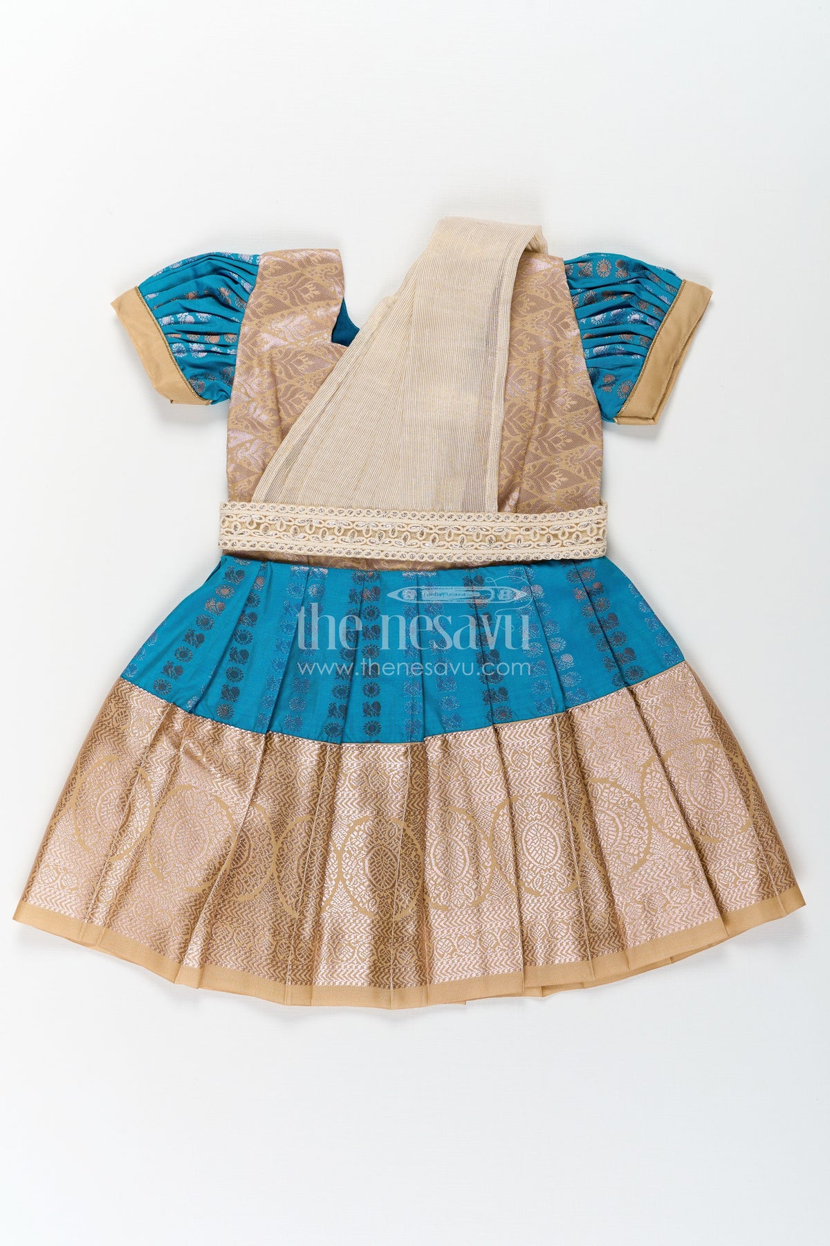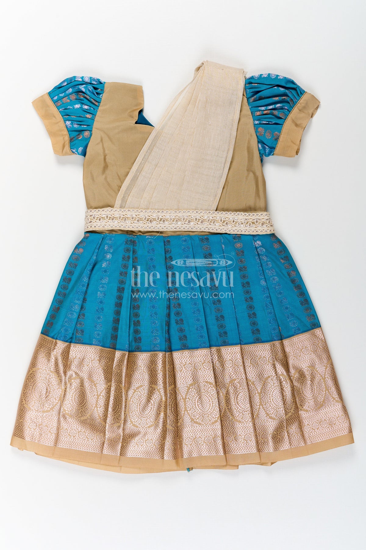 The Nesavu Girls Kanchi Silk Frock Girls Silk Dress Royal Blue with Semi Kanchivaram Weave Thread Embroidery and Lace Detailed Dupatta Nesavu 16 (1Y) / Blue / Style 1 SF843AA-16 Nesavu Royal Blue Girls Silk Dress in Semi Kanchivaram with Embroidered Dupatta and Golden Zari Details
