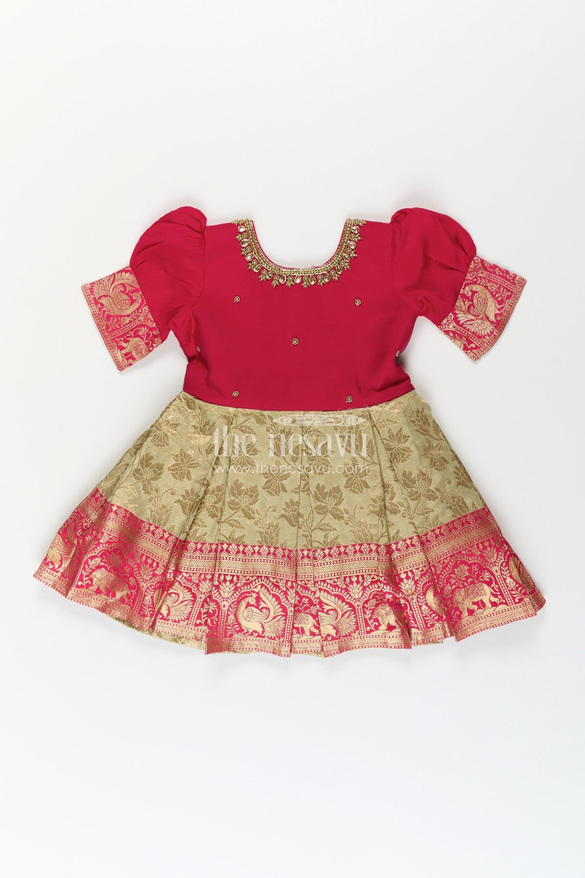 The Nesavu Silk Frock Girls First Birthday Dress in Blended Banarasi Silk with Rich Maroon Bodice and Golden Zari Skirt Nesavu Girls First Birthday Dress Banarasi Silk Embroidered Maroon Top Gold Zari Pleated Skirt | The Nesavu