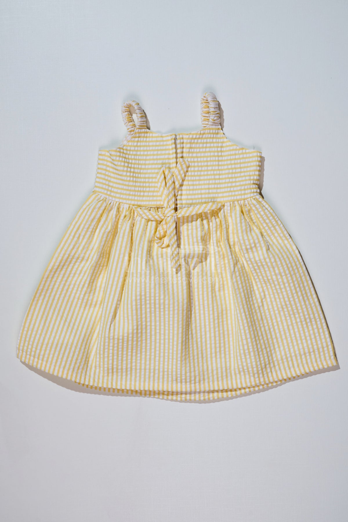 Baby Girls Lemon Yellow Dress in Seer Sucker Cotton with Floral Embroidery and Bow Detail