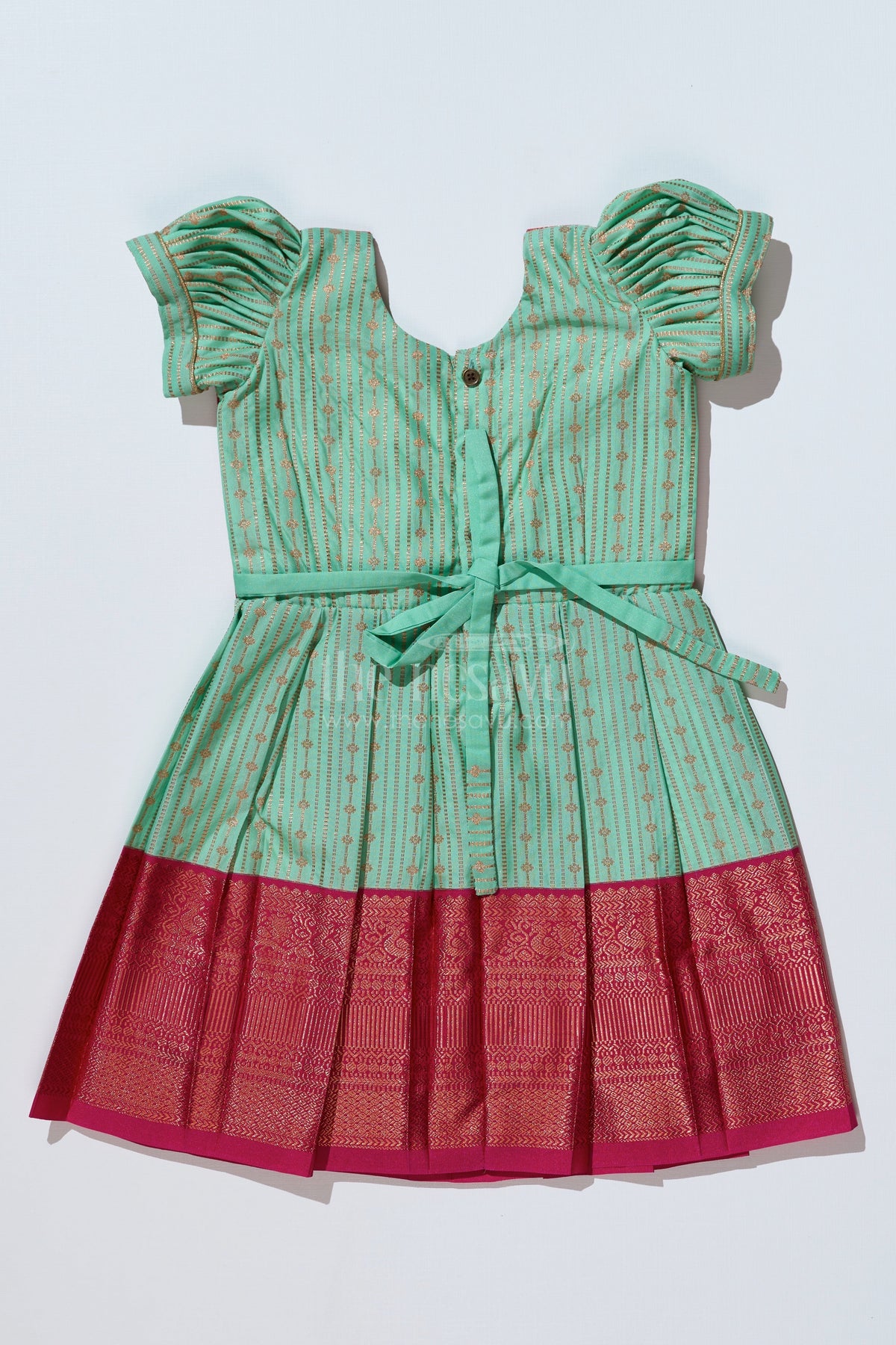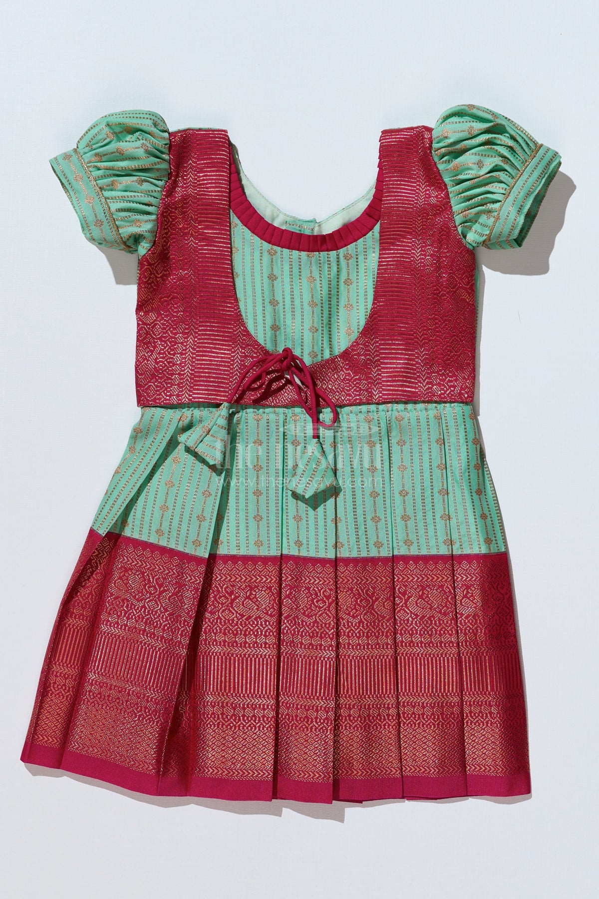 The Nesavu Girls Kanchi Silk Frock Graceful Light Green Silk Dress for Girls with Kanchipuram Inspired Design and Zari Pleated Border Nesavu 16 (1Y) / Green / Style 1 SF822BA-16 Nesavu Light Green Silk Dress Girls Kanchipuram Inspired Design Zari Pleated Border
