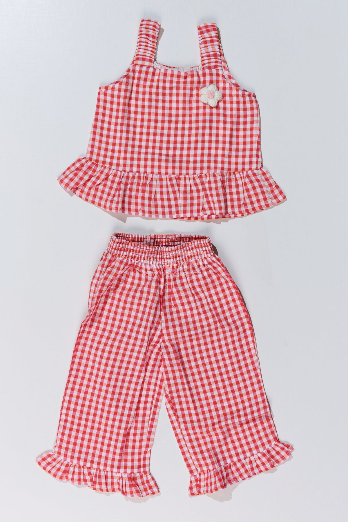 This stylish ethnic plazo set brings a perfect blend of tradition and modern fashion. Featuring a red and white gingham-checked cotton fabric, this outfit includes a sleeveless peplum-style top with ruffled shoulder straps and matching plazo pants with a playful frilled hem. The soft and breathable cotton fabric ensures comfort, making it ideal for festive gatherings, casual outings, or playful summer days. A delicate flower embellishment on the bodice adds a charming touch, enhancing the outfit's ethnic appeal. Pair it with cute sandals for a complete look.
