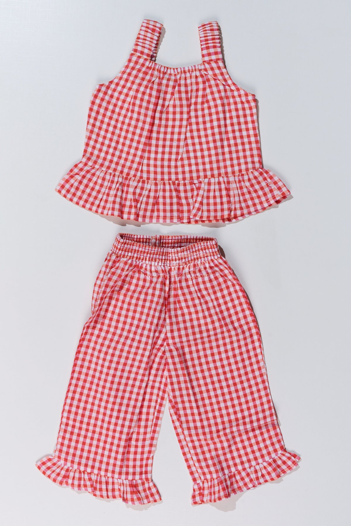 The Nesavu Girls Casual Set Girls Ethnic Plazo Set with Red and White Gingham Print and Peplum Top for Festive Style Nesavu Nesavu Girls Ethnic Plazo Set Red Gingham Peplum Top Frilled Pants Festive Fashion