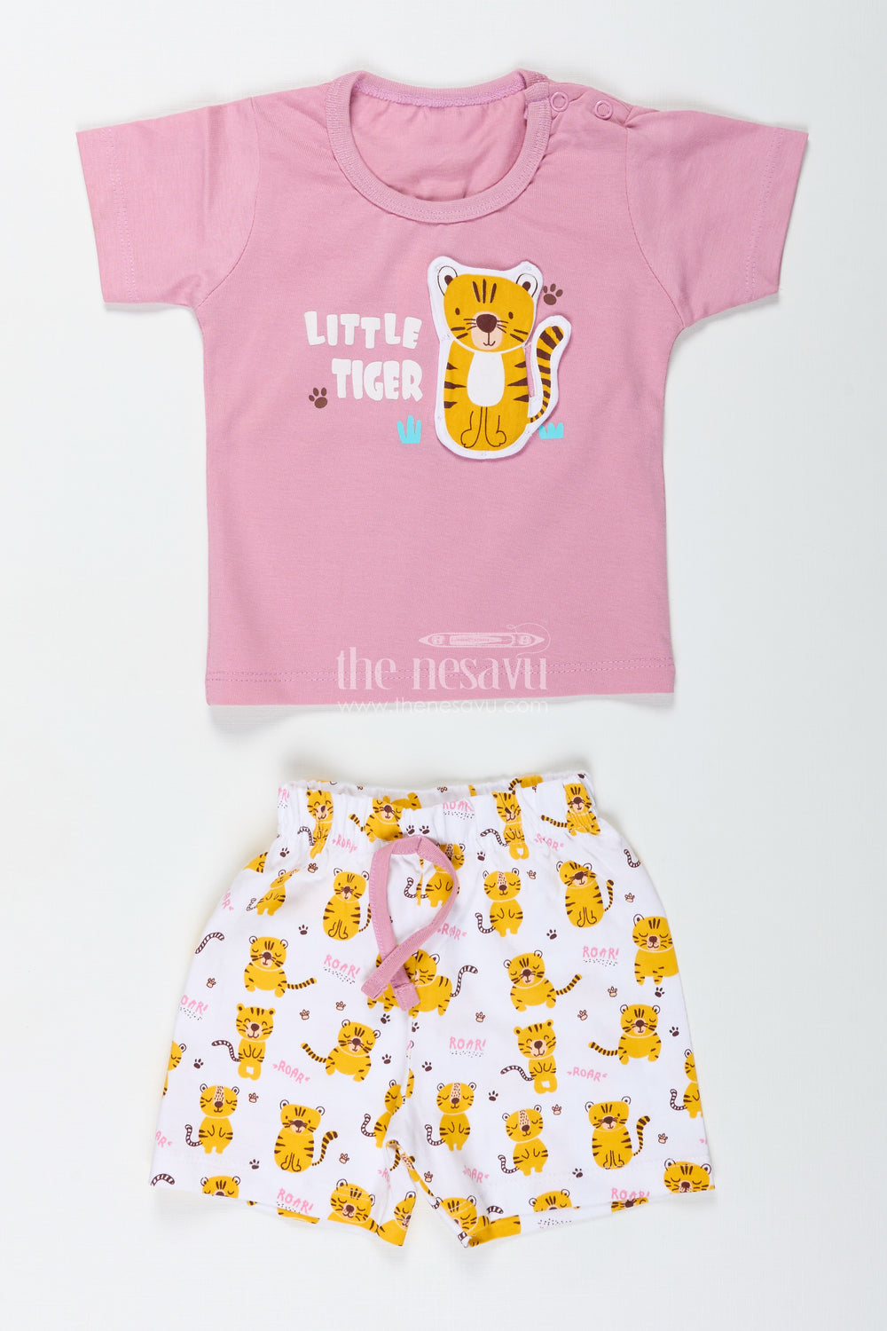 Pink t shirt and shorts set designed for boys who love bright colors and fun animal themes. This cotton ensemble includes a soft mauve-pink t-shirt printed with the phrase "Little Tiger" and a pair of matching white shorts featuring vibrant animal digital prints. The breathable fabric ensures comfort through all-day play, while the relaxed fit offers plenty of freedom for movement. Perfect for warm days, casual outings, or indoor wear, this set combines style and practicality with an extra dose of cuteness. Easy to wash and gentle on the skin, it's a must-have in any toddler’s summer wardrobe.