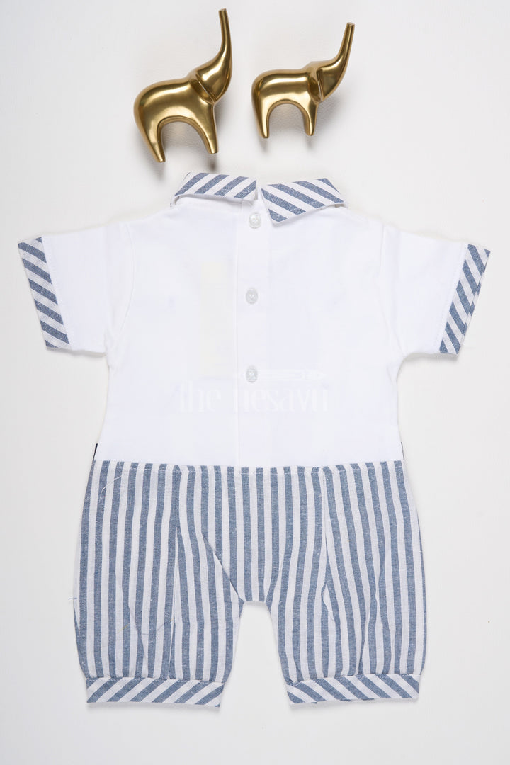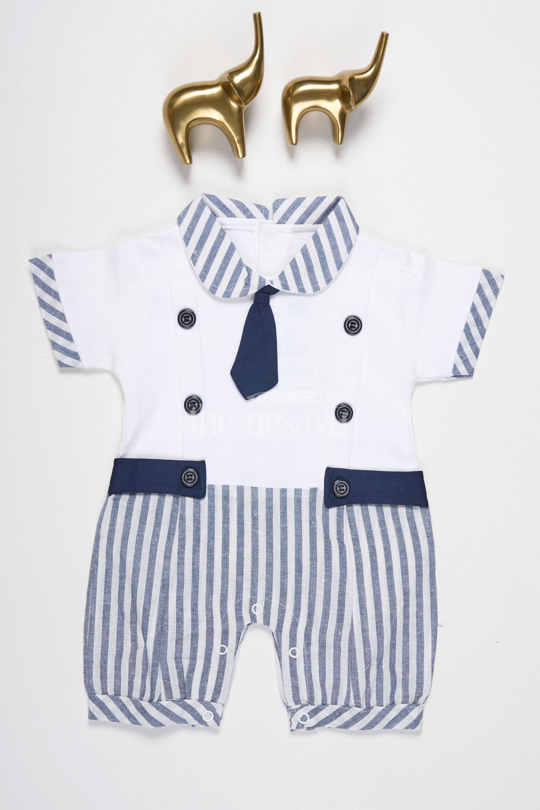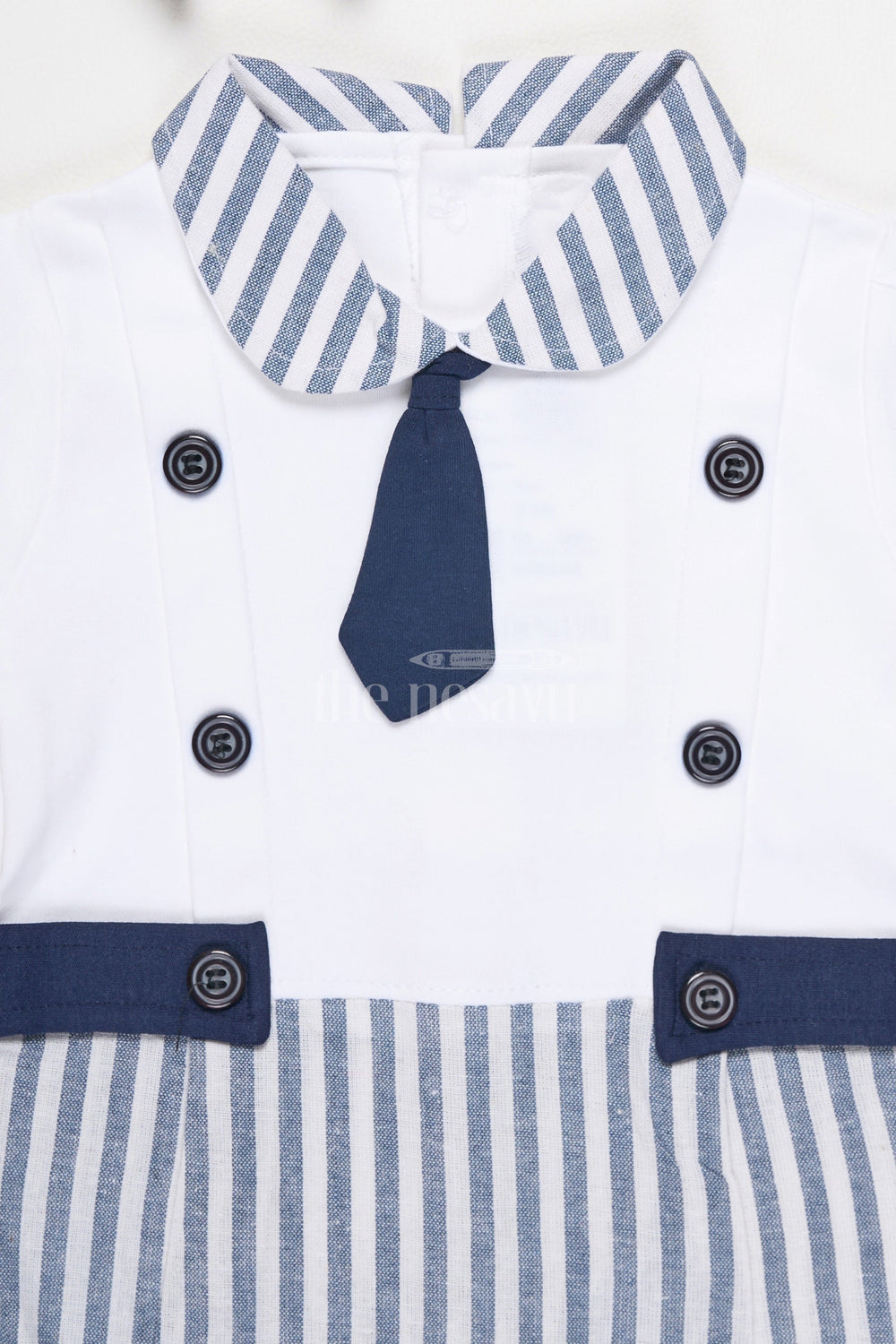 The Nesavu Baby Rompers/Onesies Baby Romper with Navy and White Striped Sailor Collar Design for Nautical-Themed Outfits Nesavu 10 (NB) / Half white BCS161B-10 Nesavu Baby Sailor Romper Navy White Stripes Buttoned Belt Nautical-Inspired Design