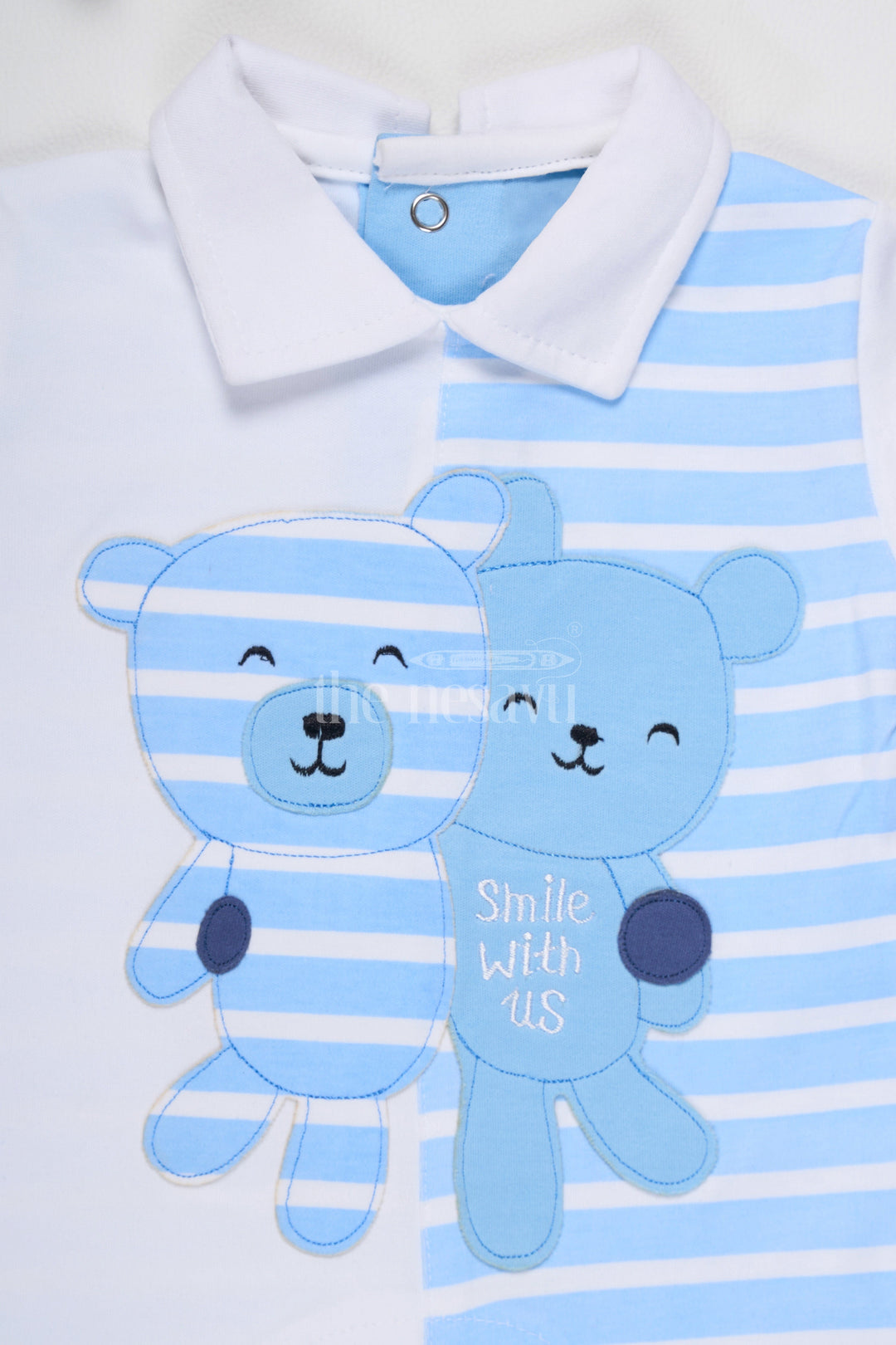 Baby Blue Striped Romper with Teddy Bear Appliques and Snap Buttons for Easy Wear