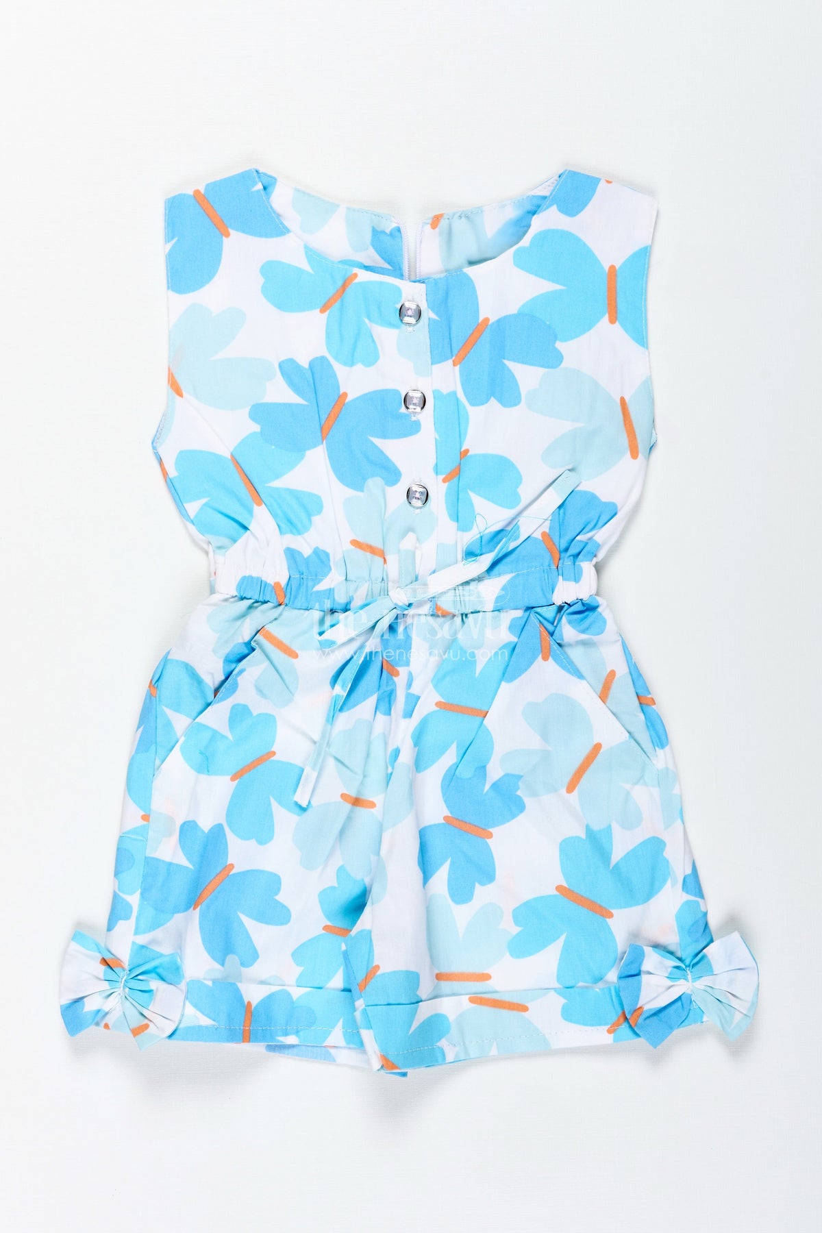 Girls Blue Floral Cotton Jumpsuit with Bow Headband for Summer Adventures