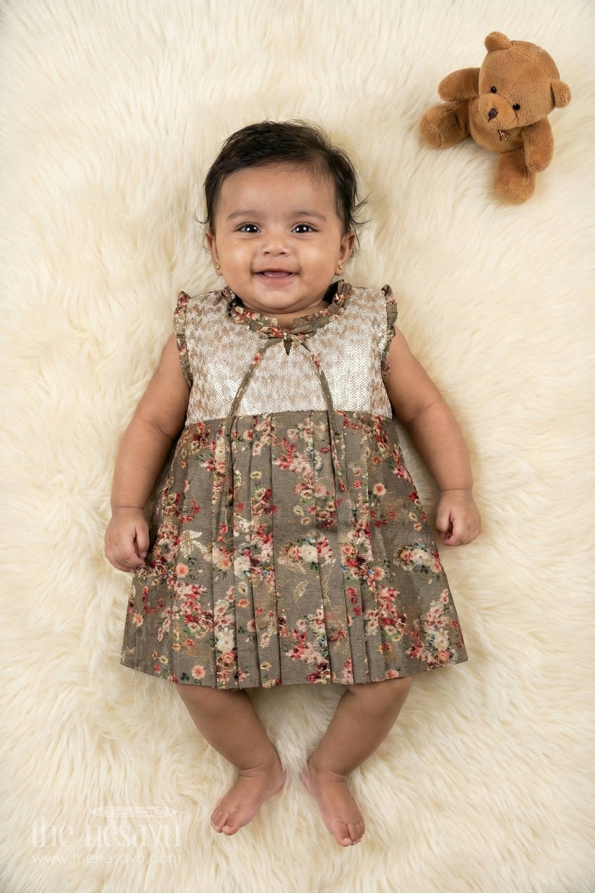 Presenting our exquisite Baby Girl Floral Cotton Frock, a staple for any fashionable infant's wardrobe. This charming dress is designed with a blend of golden and olive tones adorned with vibrant floral patterns, perfect for everyday elegance or special occasions. The frock features a sequined upper bodice with a delicate tie at the neckline, enhancing its enchanting appeal. Crafted from soft, high-quality cotton, it ensures comfort and durability for all-day wear.