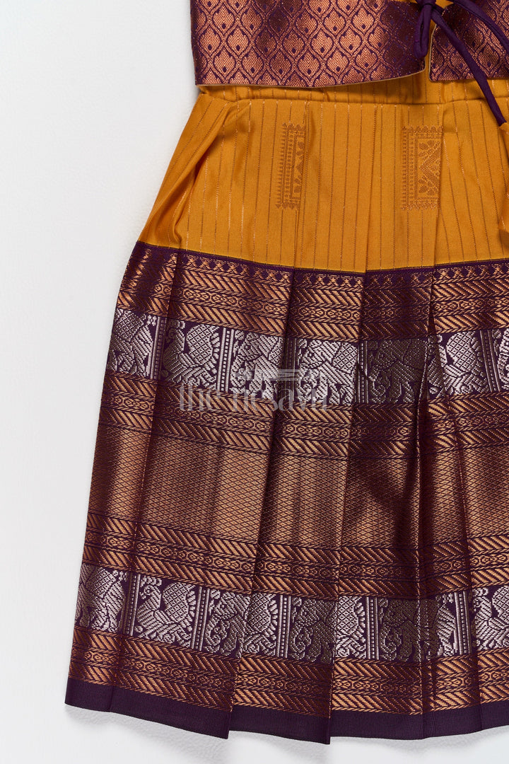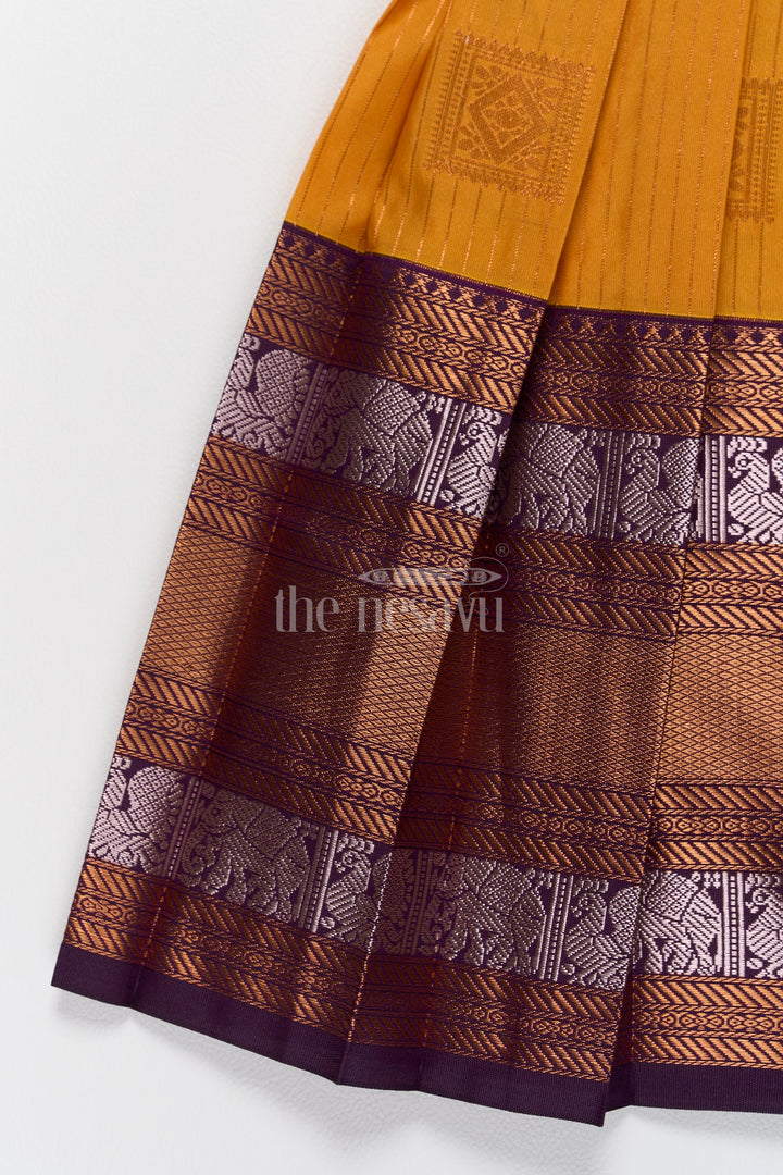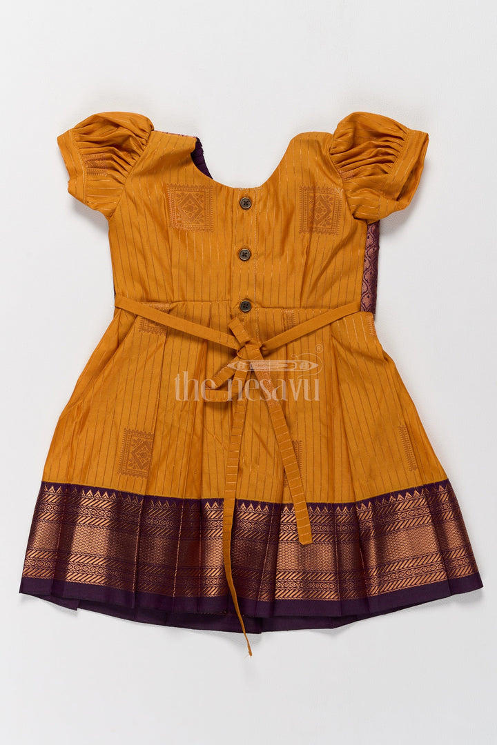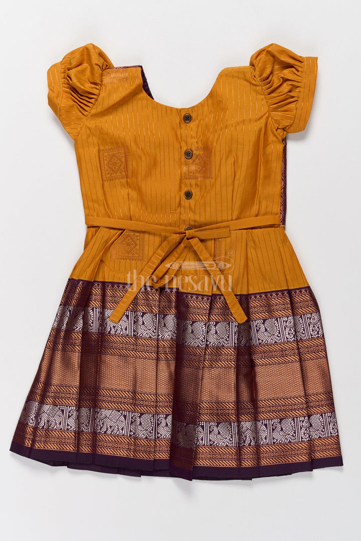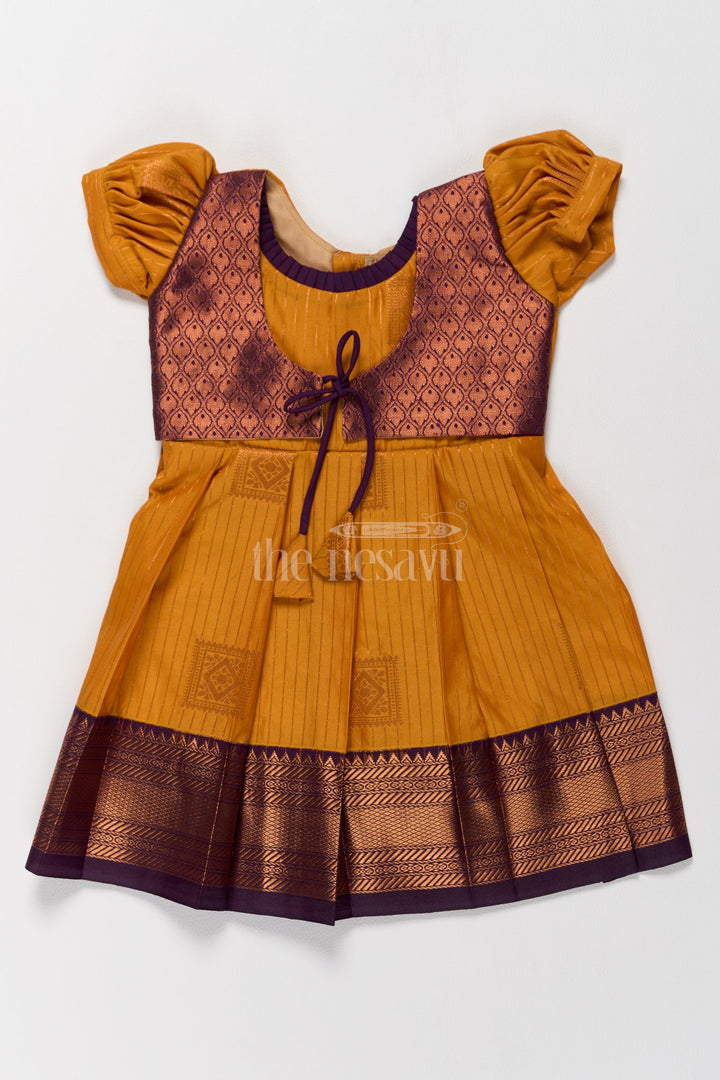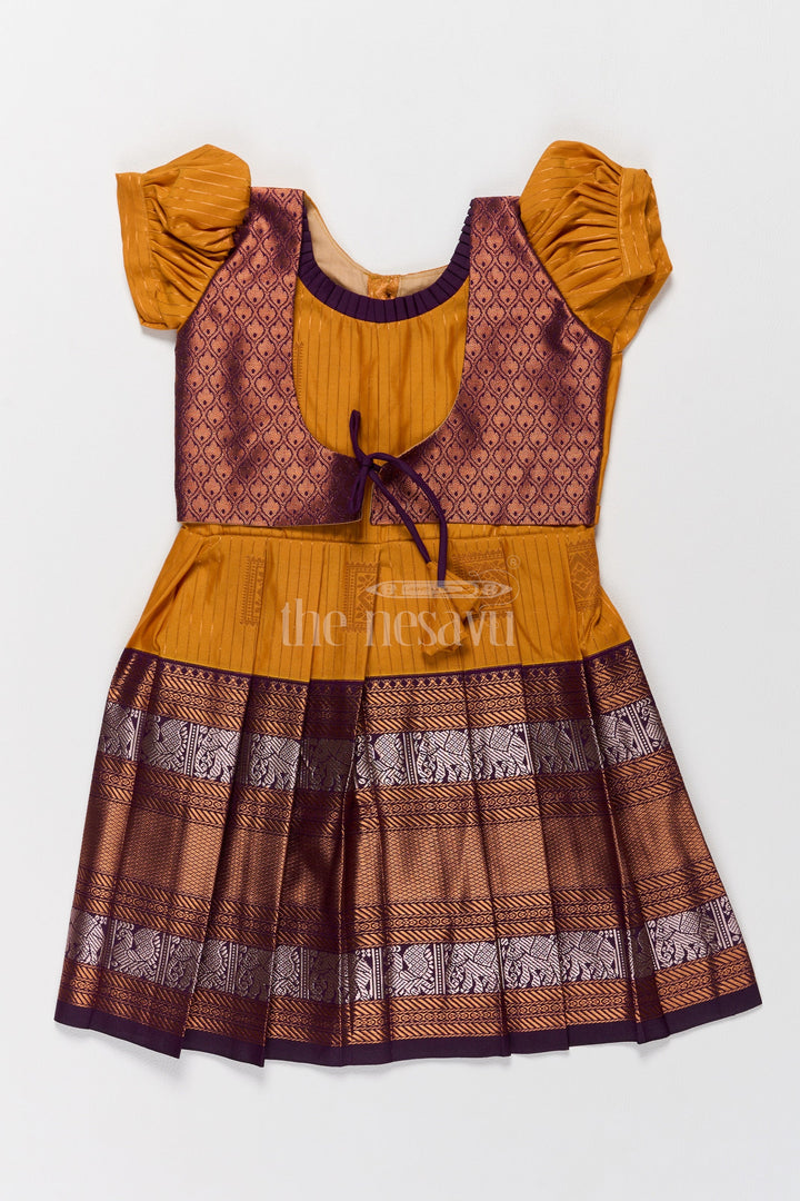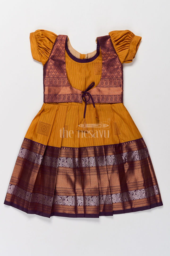 Introduce your little one to timeless elegance with this exquisite Pattu Frock crafted from premium blend silk. The vibrant mustard yellow bodice is beautifully complemented by a chocolate-brown zari border featuring intricate elephant motifs, perfect for festive gatherings. The puff sleeves add a charming touch of tradition, while the tie-back waist ensures a secure and adjustable fit. Designed with a pleated skirt for a regal silhouette, this frock promises comfort and style. Whether for Pongal celebrations or family weddings, this frock embodies tradition with a modern flair. Its breathable fabric ensures all-day comfort for your little fashionista.