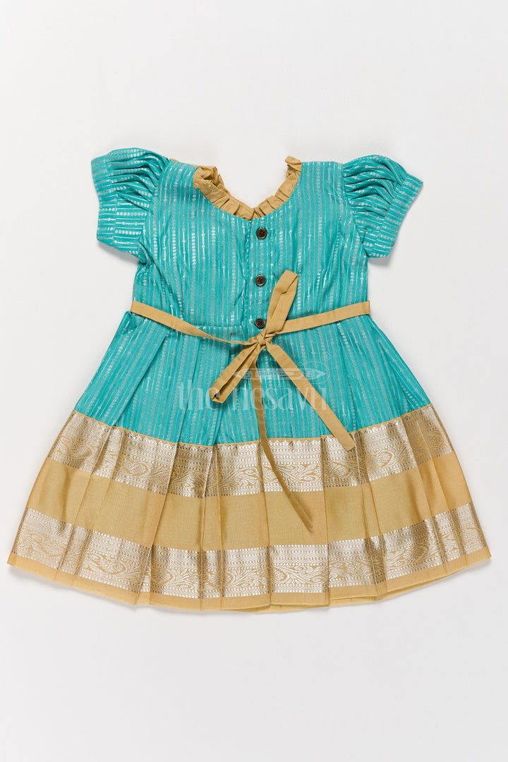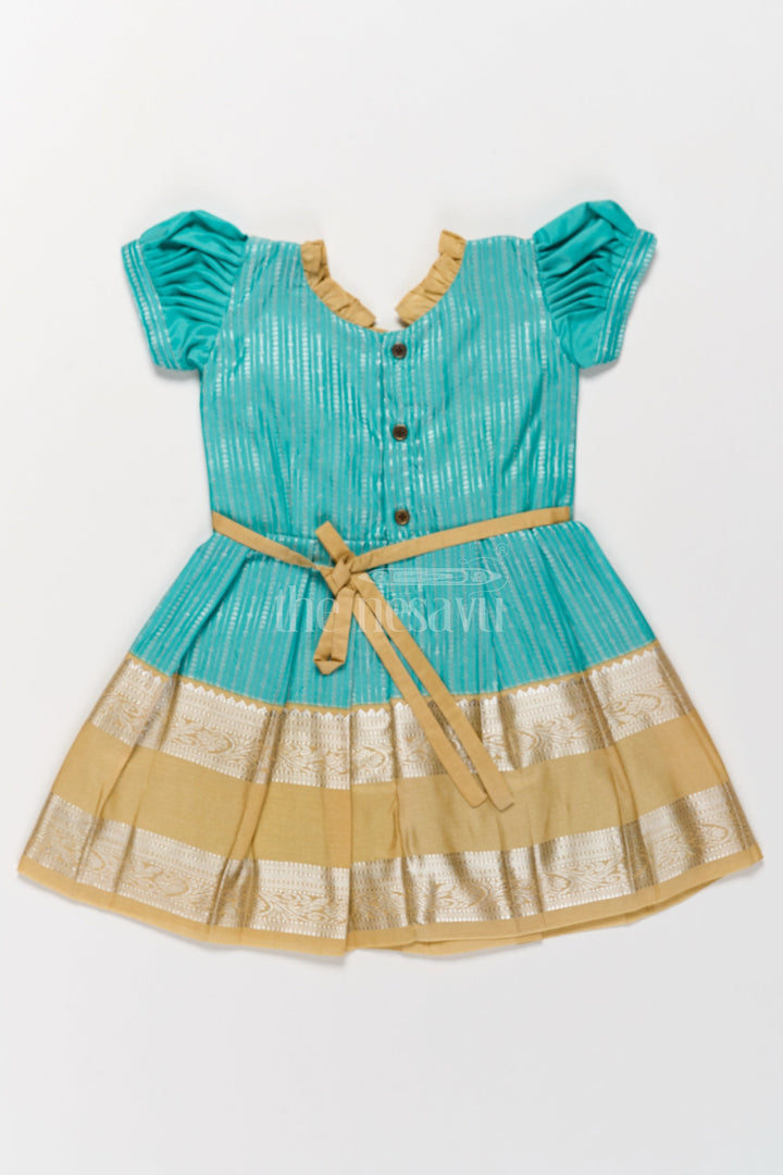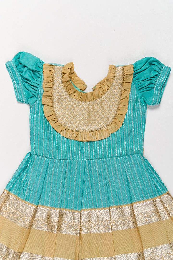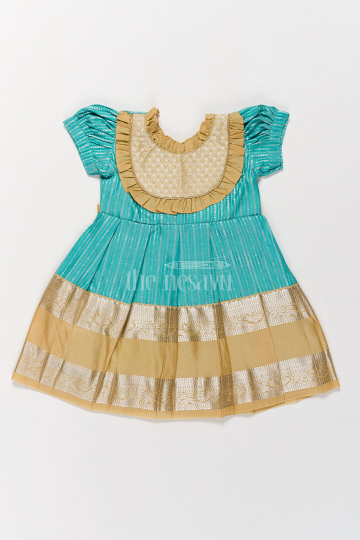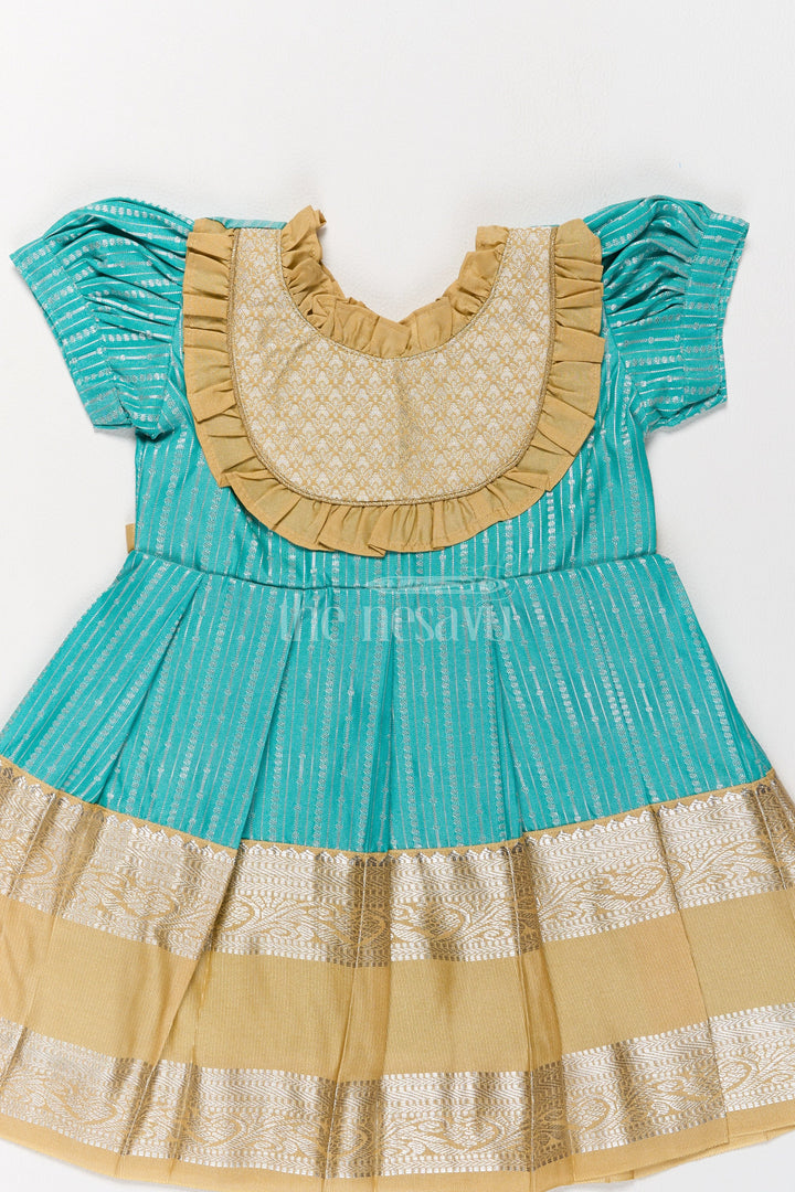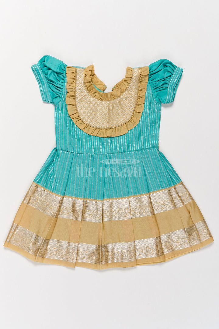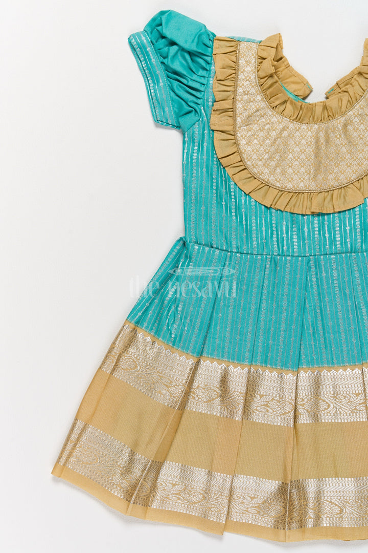 Infuse traditional charm into your child’s wardrobe with this green and gold Kanchi silk frock. The rich blend silk material features a metallic golden yoke with intricate ruffle details that complement the finely pleated skirt. Designed to be lightweight and breathable, this frock is perfect for Pongal festivities and other traditional occasions. The puffed sleeves and detailed craftsmanship make this a standout piece for your child’s special moments.