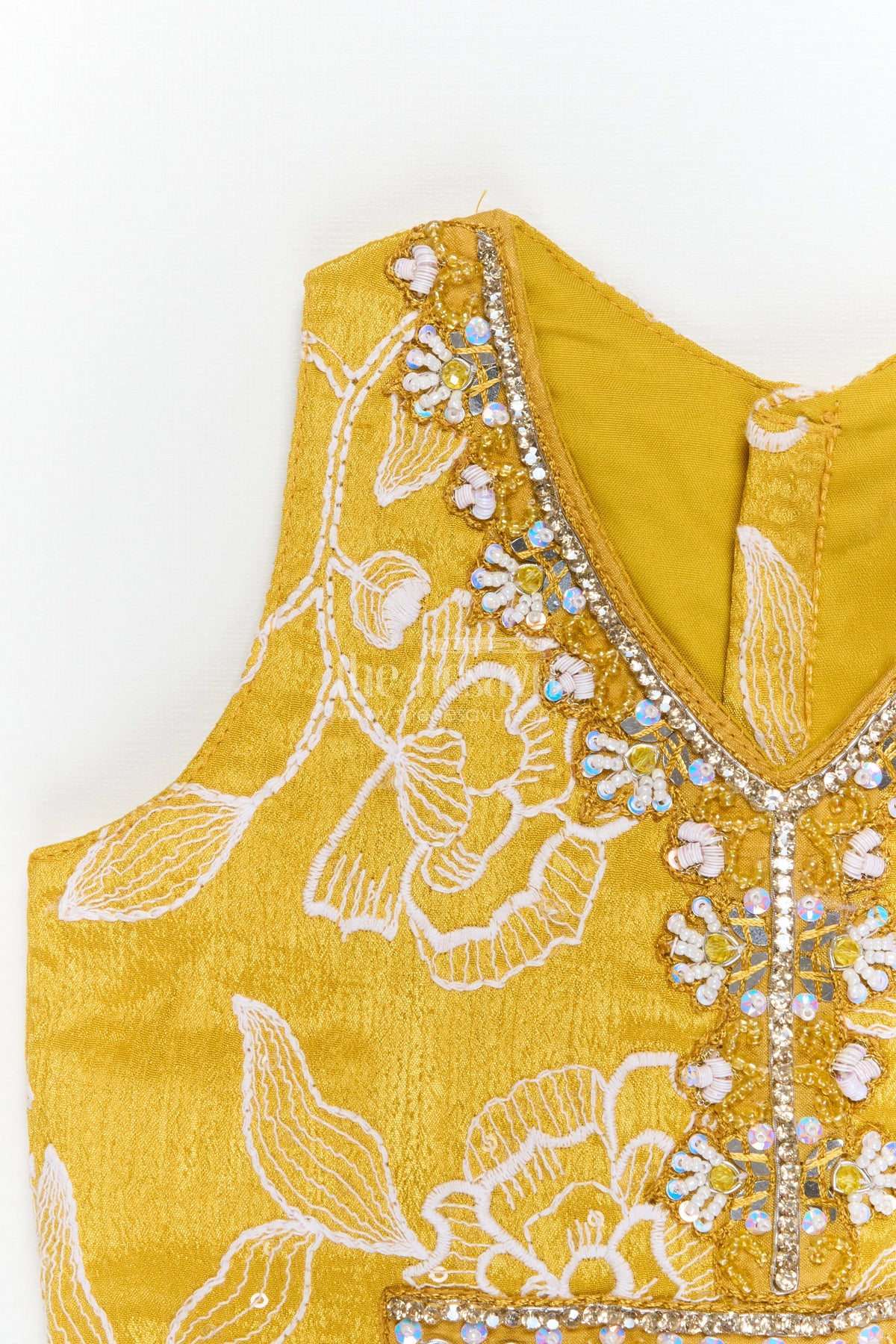 Features a sleeveless blouse with floral embroidery and mirror accents