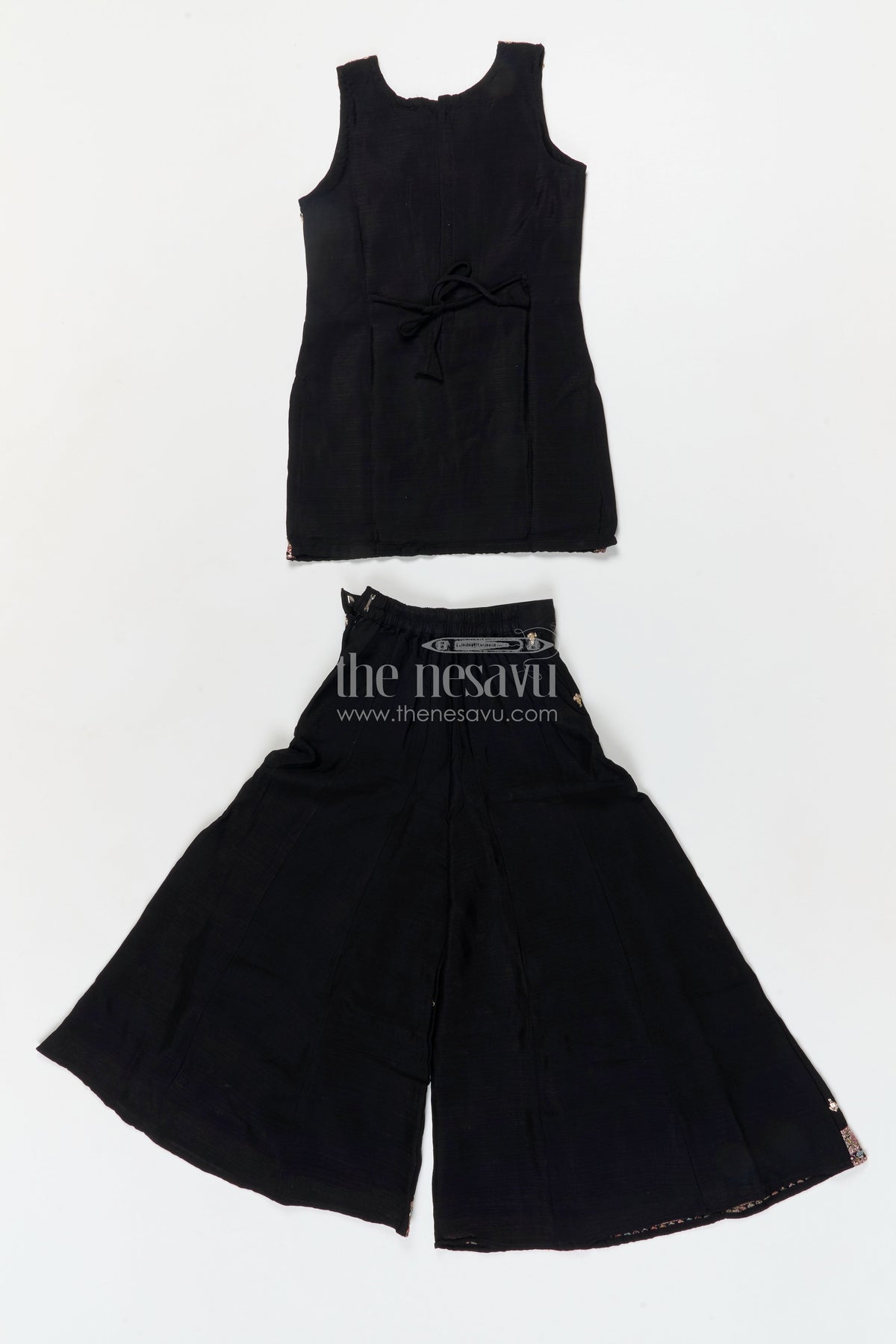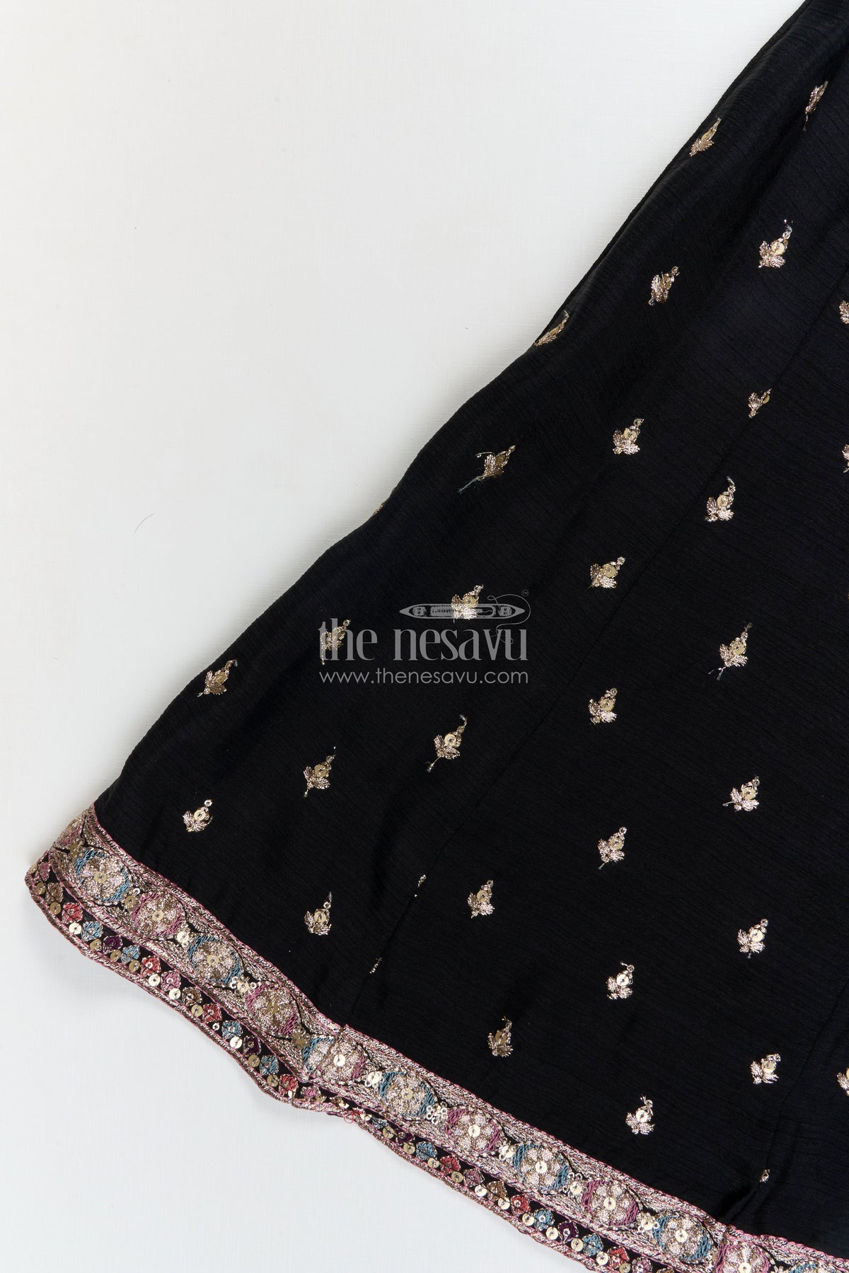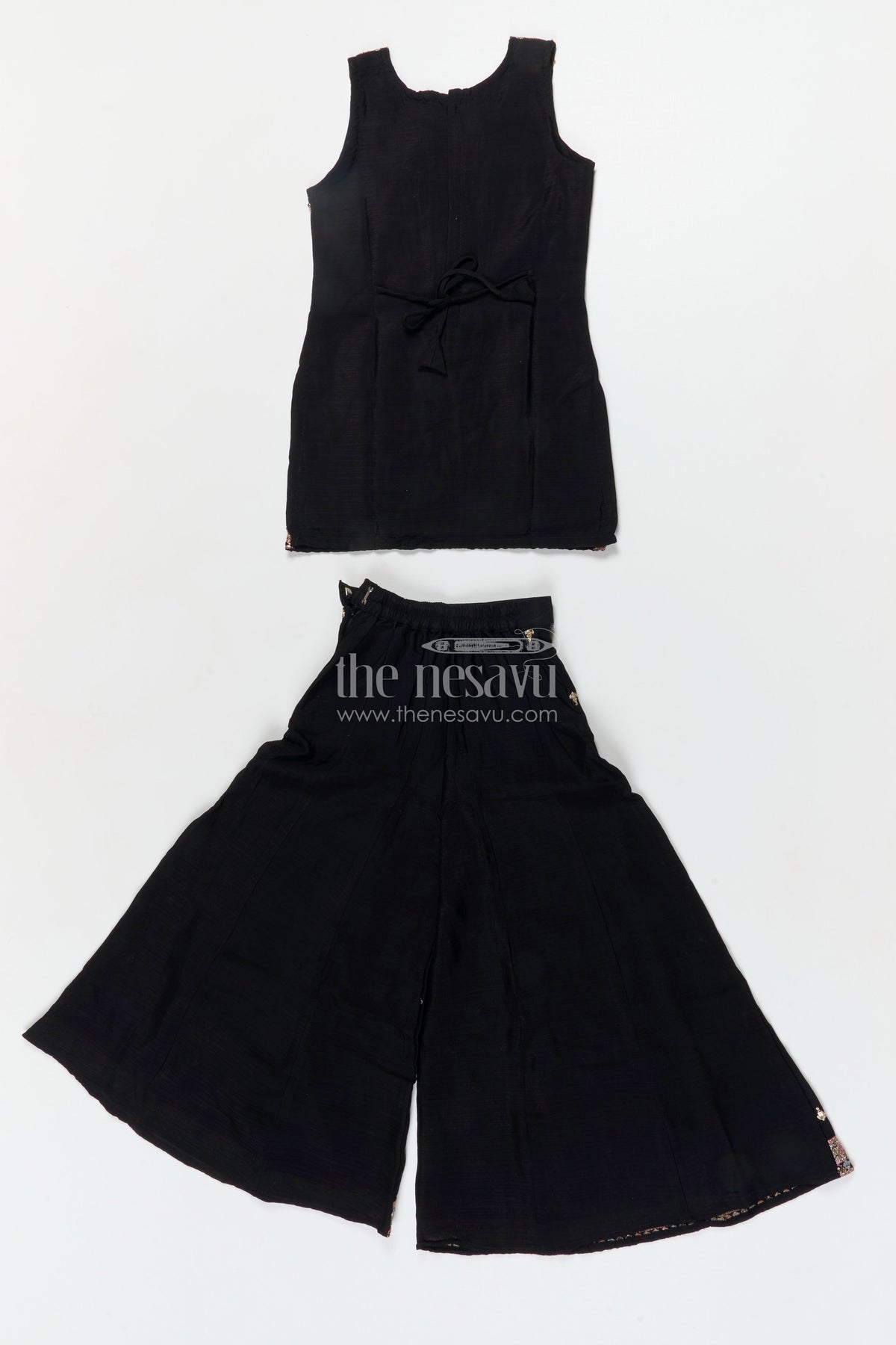 This girls sharara set for festive occasions features a straight-cut georgette top paired with a designer sharara