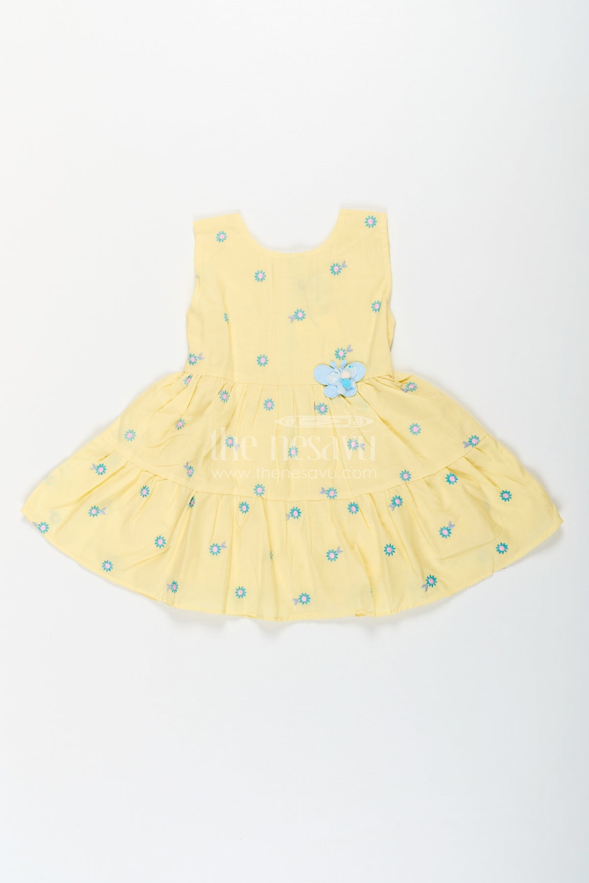 The butterfly birthday dress is a cheerful and bright choice for any little girl's celebration. Designed in a vibrant yellow shade, this sleeveless frock is made from soft cotton with delicate embroidery throughout. Tiny embroidered daisies scatter across the fabric, while a whimsical blue butterfly appliqué at the waist adds a playful and festive charm. The flared, ruffled hem enhances the twirl factor, making it a favorite for parties and special occasions. Lightweight and breathable, this dress keeps your child comfy even during long hours of play and excitement. It’s easy to wear, stylish, and filled with joyful details that little ones will adore.
