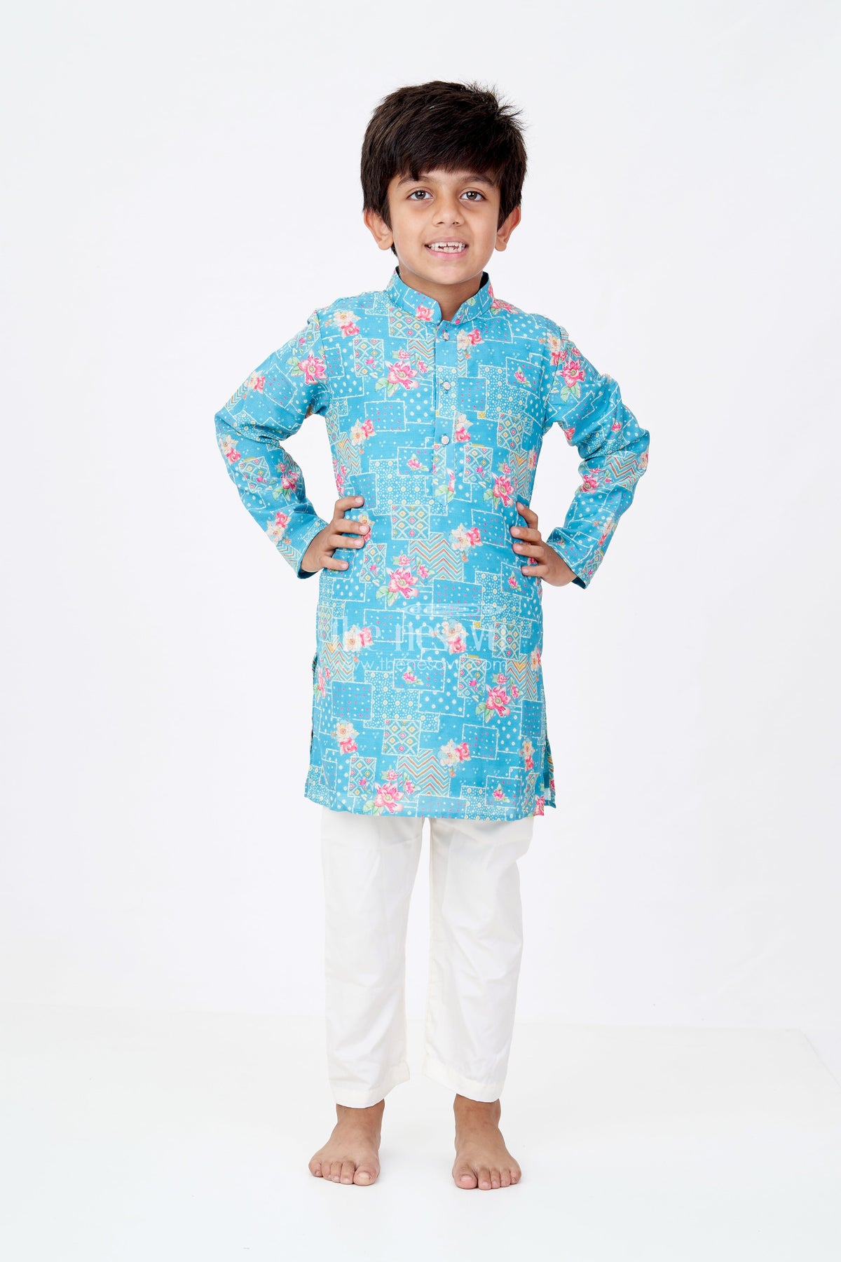 The Nesavu Boys Kurtha Set Boys Cotton Tissue Printed Shirt Kurta Set in Aqua Teal with Geometric and Floral Digital Print Nesavu Nesavu Boys Printed Shirt Kurta Set Cotton Tissue Aqua Teal Base Digital Floral Accents