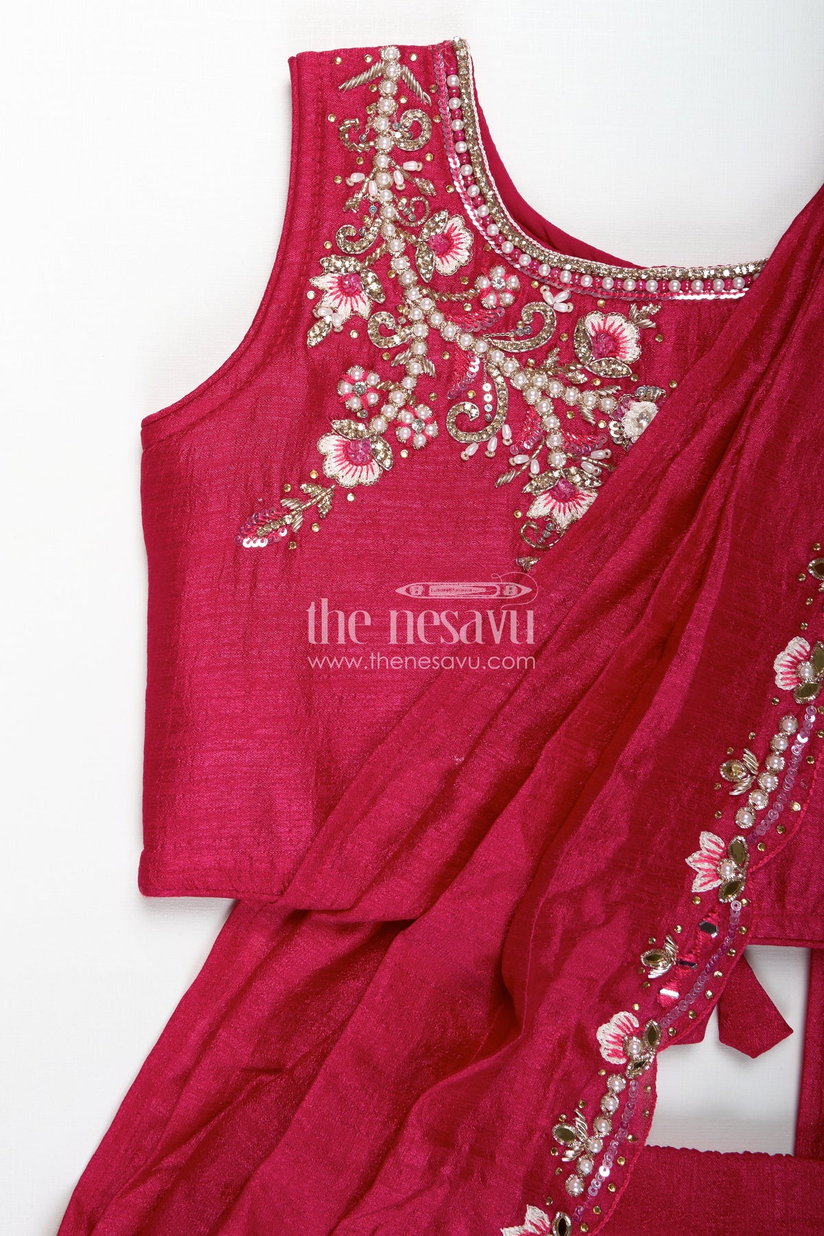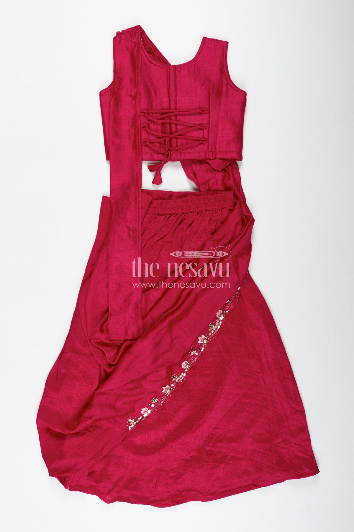 This elegant Kids Lehenga Choli Set from Nesavu brings classic ethnic fashion to your little girl’s wardrobe. Designed in a rich maroon shade, the ensemble is made from premium pure georgette and features intricate designer embroidery on the sleeveless blouse. The flared lehenga offers a graceful flow, while the matching dupatta is adorned with matching embroidered details that add a refined finish. Ideal for festive occasions and family events, this set ensures both style and comfort. The high-quality fabric is lightweight and breathable, allowing for ease of movement, while the embroidered detailing adds a hint of traditional charm. Your child will look effortlessly stylish in this beautifully crafted outfit.