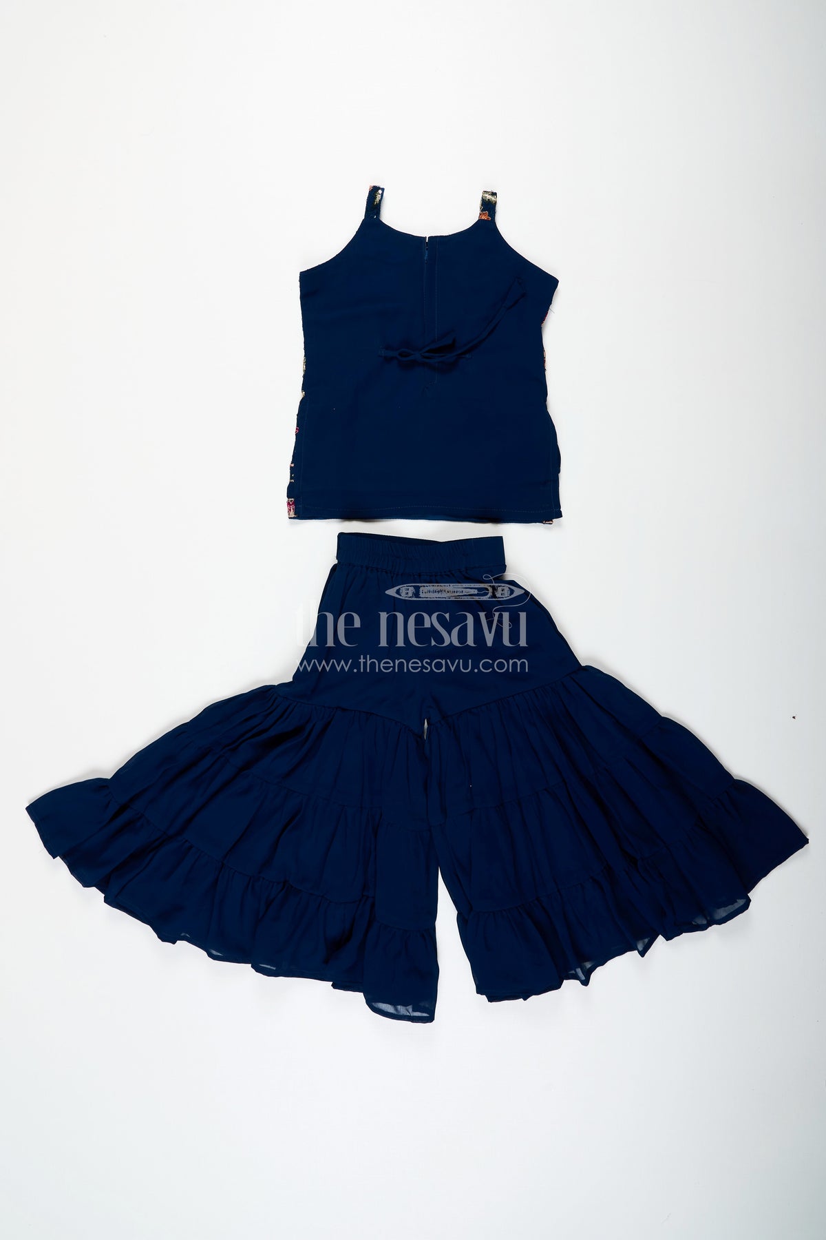The Nesavu Girls Sharara / Plazo Set Girls Western Sharara Set in Navy Blue with Embroidered Spaghetti Top and Flowy Pants Nesavu 24 (5Y) / Blue GPS517A-24 Girls Western Sharara Set Navy Blue Embroidered Spaghetti Top Dupatta | The Nesavu