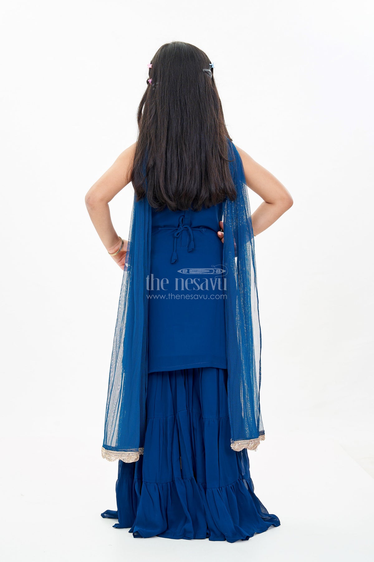 The Nesavu Girls Sharara / Plazo Set Girls Western Sharara Set in Navy Blue with Embroidered Spaghetti Top and Flowy Pants Nesavu 24 (5Y) / Blue GPS517A-24 Nesavu Girls Western Sharara Set Navy Blue Embroidered Spaghetti Top Dupatta