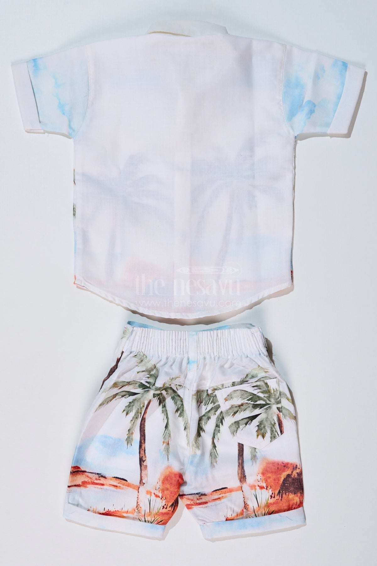 This boys stylish casual shirts set is inspired by tropical beachwear, featuring a beautifully printed short-sleeved shirt and matching shorts. The serene palm tree design on an ivory base gives a refreshing and breezy look, perfect for vacations, poolside outings, and relaxed summer days. Made from lightweight tropical-printed cotton, this set ensures breathability and comfort while keeping your little one effortlessly stylish.