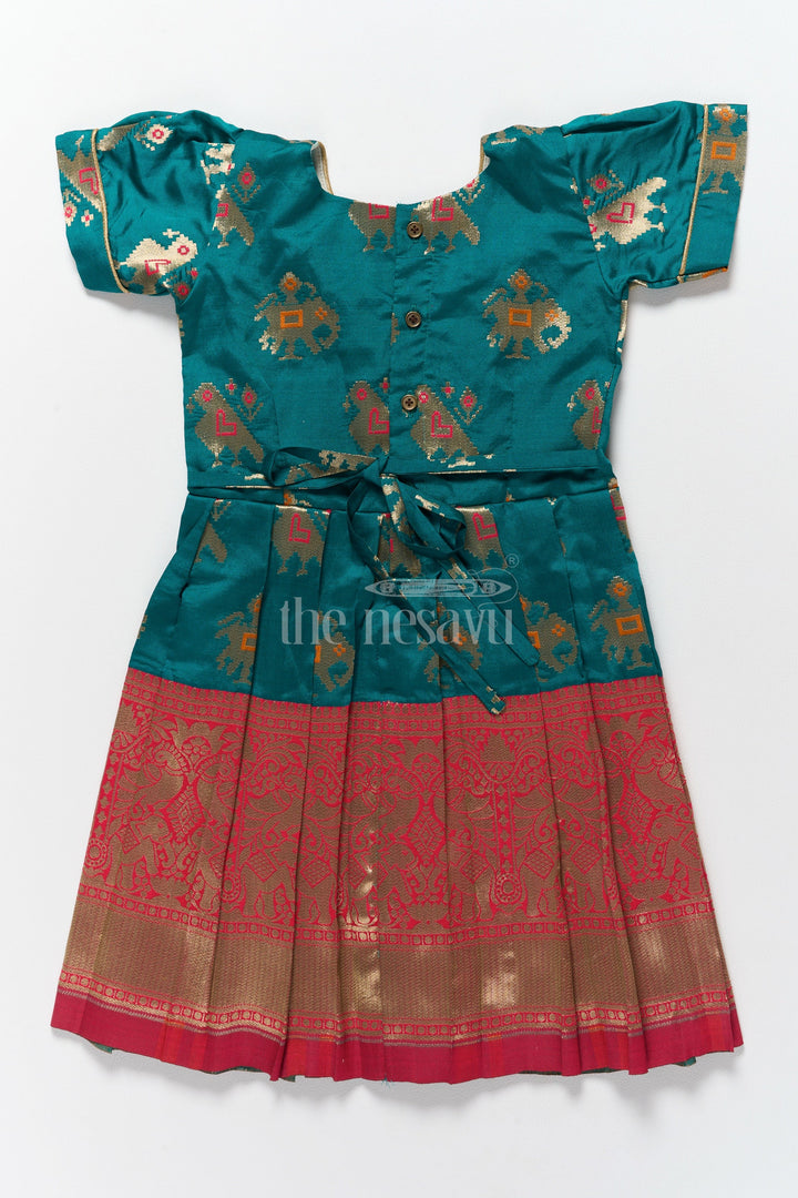 This elegant green and red frock, made from premium jacquard silk, is a true embodiment of traditional style and modern design. Featuring a rich green bodice adorned with golden jacquard motifs and charming puff sleeves, it ensures a festive vibe. The pleated skirt showcases intricate golden patterns set against a vibrant red background, exuding sophistication. Perfect for weddings, Navratri, or family gatherings, this frock combines aesthetic appeal with comfort, ensuring your child feels both stylish and at ease throughout the occasion. A timeless addition to any little girl's wardrobe, it radiates cultural elegance and charm.