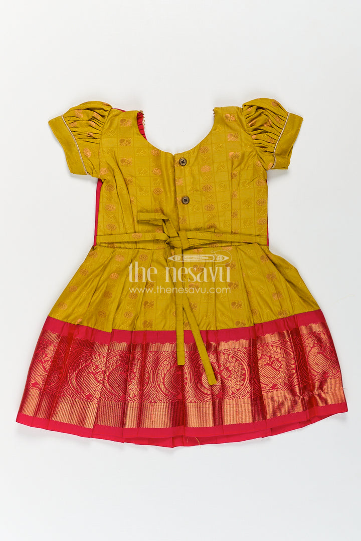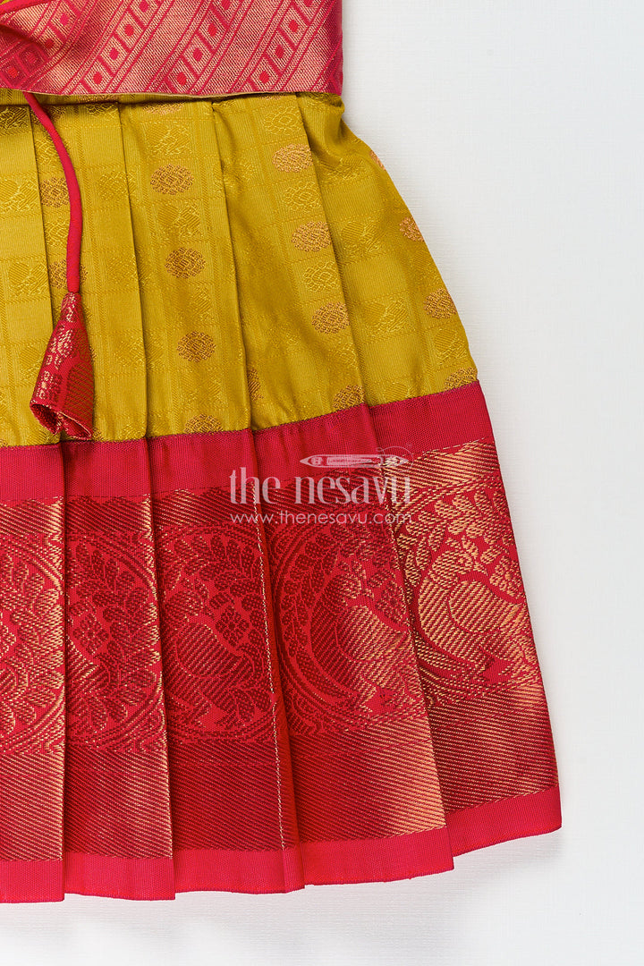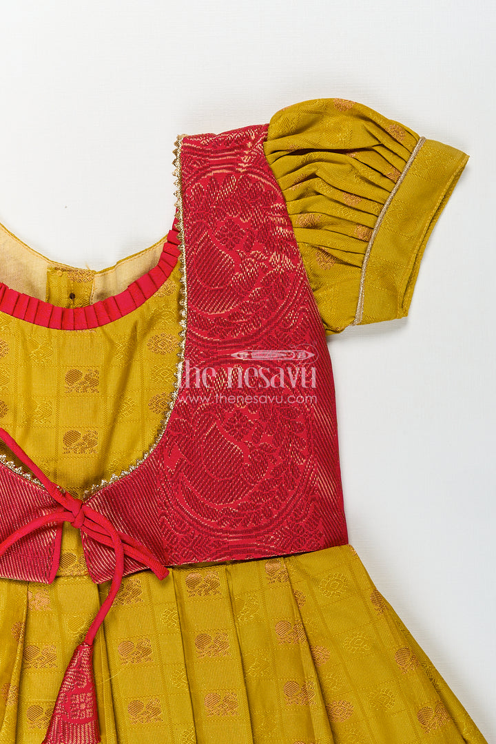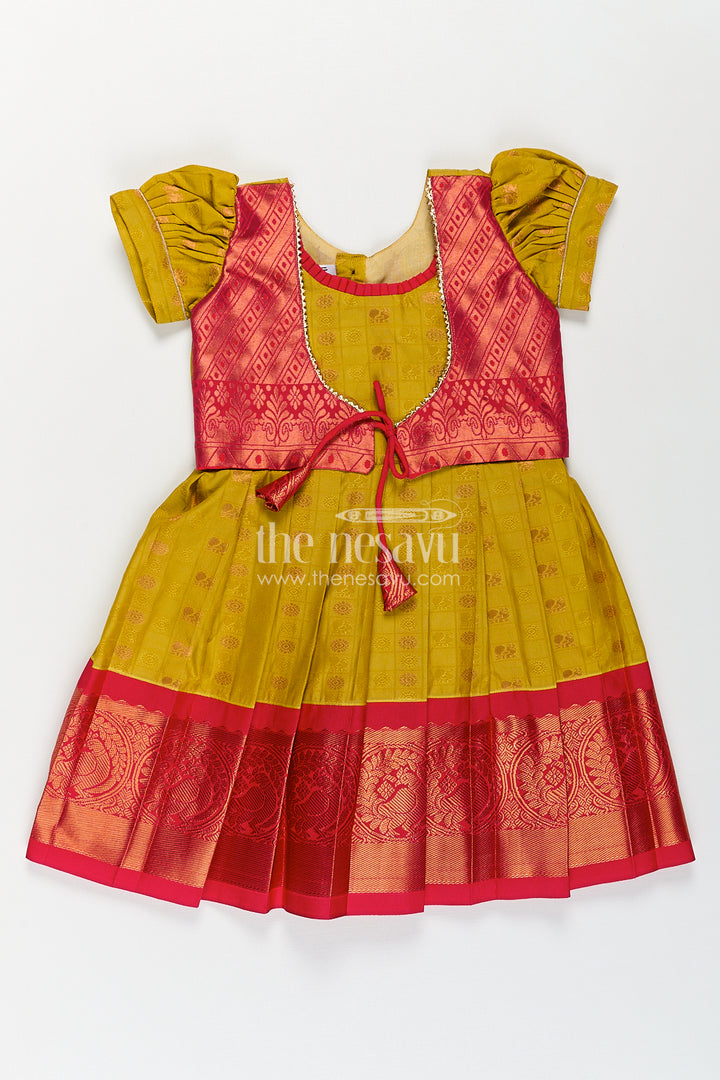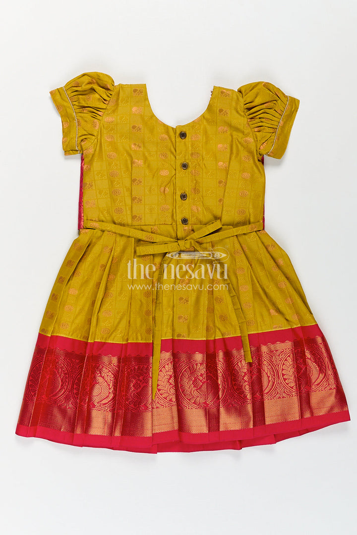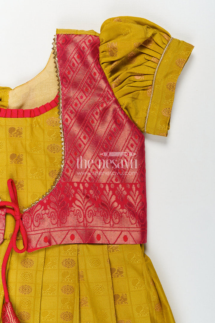 This vibrant yellow silk frock is a radiant choice for girls who love to shine in traditional elegance. Crafted from luxurious semi kanchivaram silk, the frock features a brilliant yellow body adorned with delicate golden motifs, creating a festive and graceful silhouette. The design includes short puff sleeves and a beautifully woven maroon overlay bodice, accented with a tie-up tassel detail at the front for added charm. The skirt showcases a broad maroon zari border with intricate traditional patterns, giving the outfit an opulent finish that is perfect for special occasions. Designed to offer both style and comfort, this frock allows easy movement and a breathable fit, making it ideal for long celebrations. The vibrant color palette and rich textures make this yellow silk frock a standout choice for weddings, festive functions, and cultural gatherings. Its timeless appeal ensures it becomes a cherished piece in any little girl’s traditional collection.