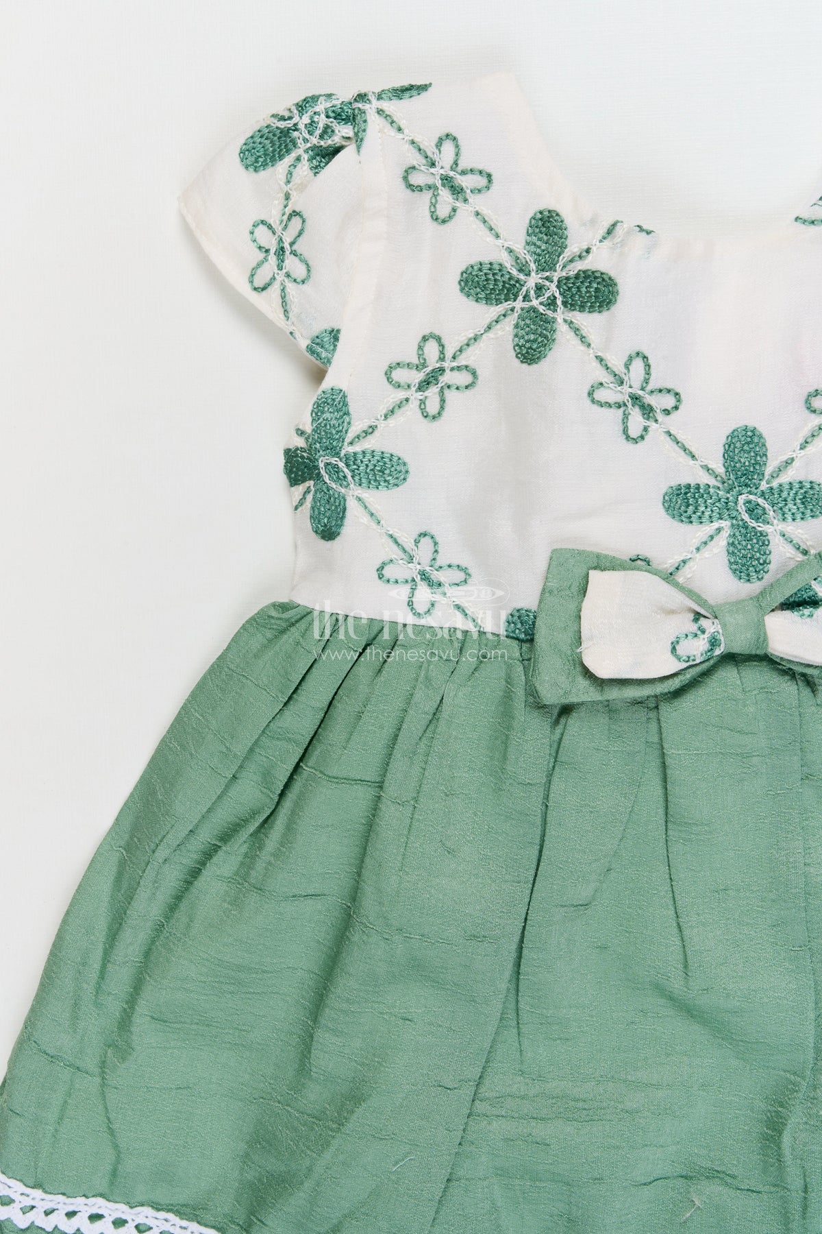 - Design: Floral embroidery, pleated skirt, lace trim