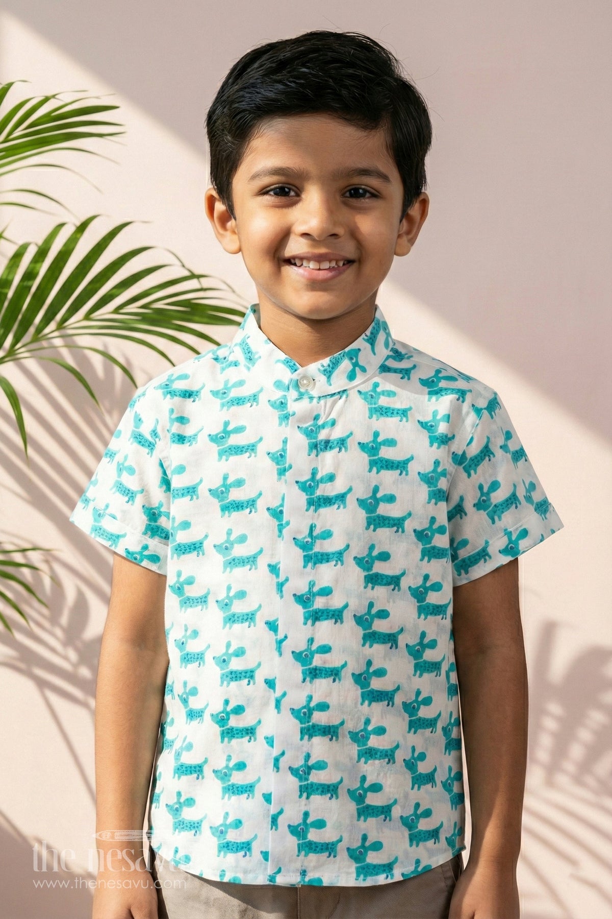 The Nesavu Boys Cotton Shirt Boys Shirt Half Sleeve in Cotton Block Print with Cute Dog Pattern Nesavu 16 (1Y) / Turquoise BS245A-16 Nesavu Boys Shirt Half Sleeve Cotton Block Print Fun Dog Motif
