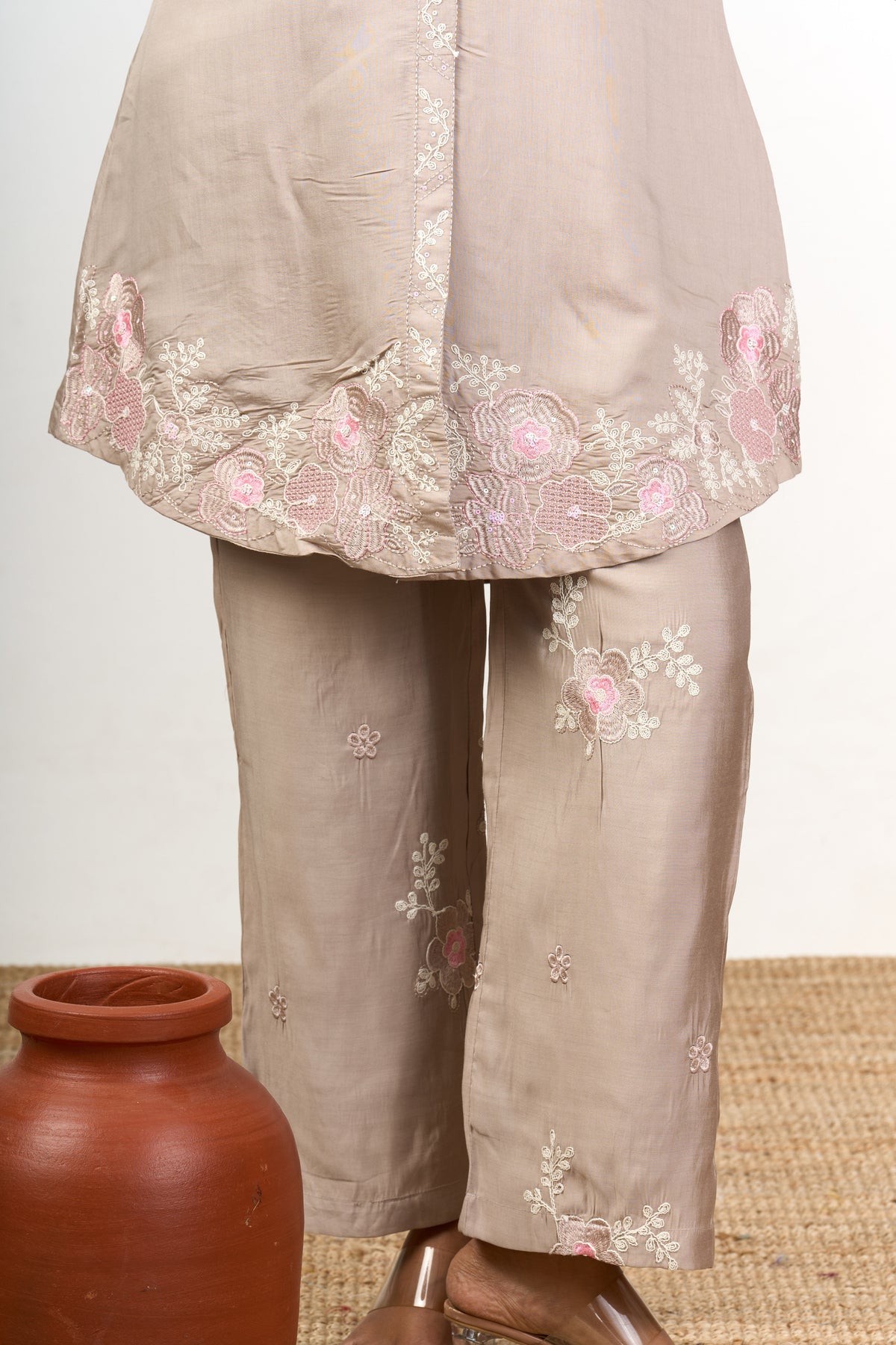Upgrade your casual chic with this elegant linen co ord trouser set in a subtle taupe shade. Tailored from premium cotton fabric, the set features a sophisticated shirt-style top with a relaxed fit, complemented by intricate pink and white embroidery on the cuffs and hemline. The coordinated trousers boast floral embroidery, creating a harmonious and refined look. The breathable fabric and relaxed silhouette ensure all-day comfort, while the subtle color palette makes it perfect for any season. Whether you're stepping out for a lunch date or a casual evening gathering, this co ord set will keep you looking polished and poised.