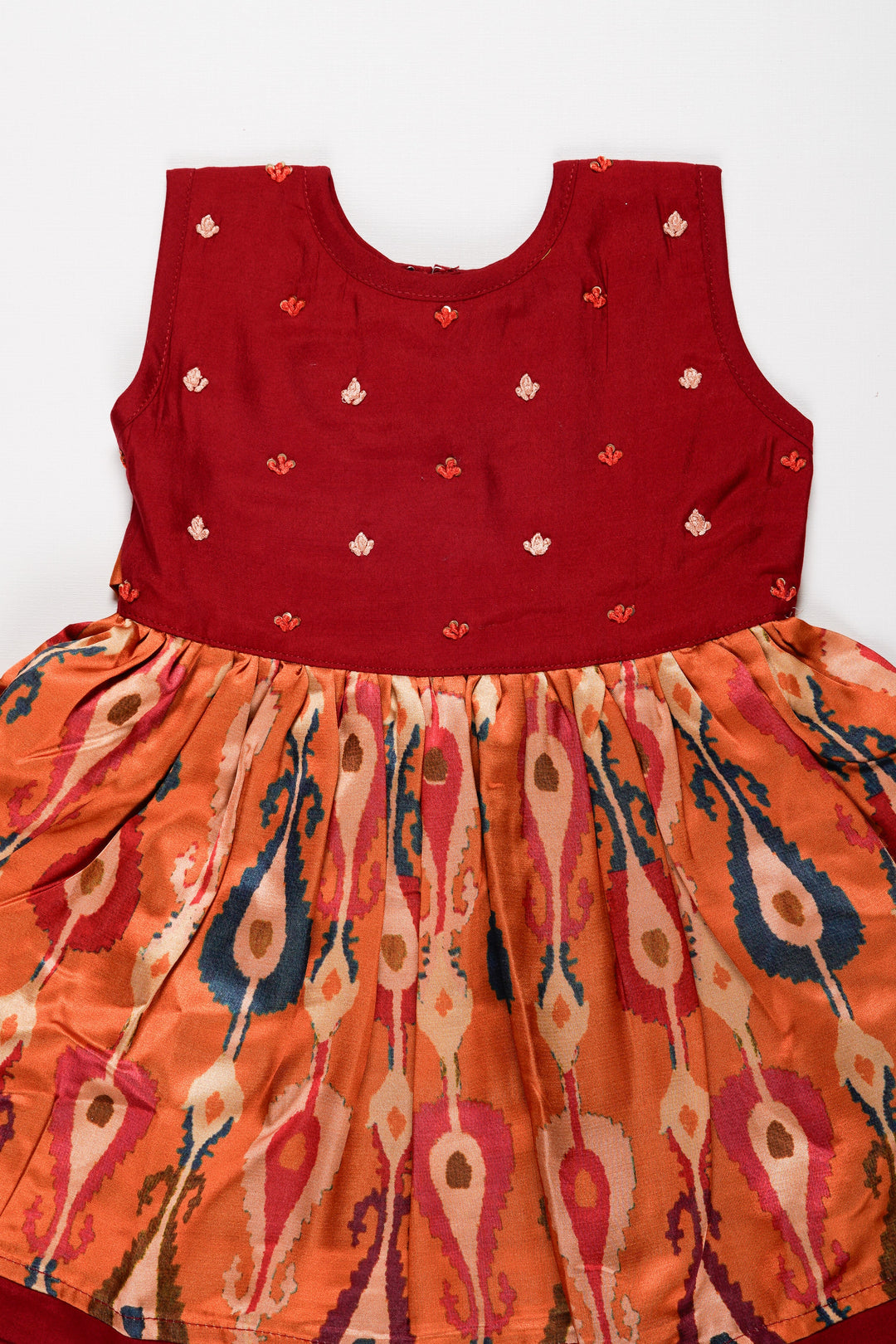 The Nesavu Girls Cotton Frock Charming Girls Chanderi Cotton Party Frock - Floral and Ethnic Print Nesavu 16 (1Y) / Orange / Blend Silk GFC1312A-16 Stylish Girls Chanderi Cotton Frock | Floral Embroidered Party Wear | The Nesavu