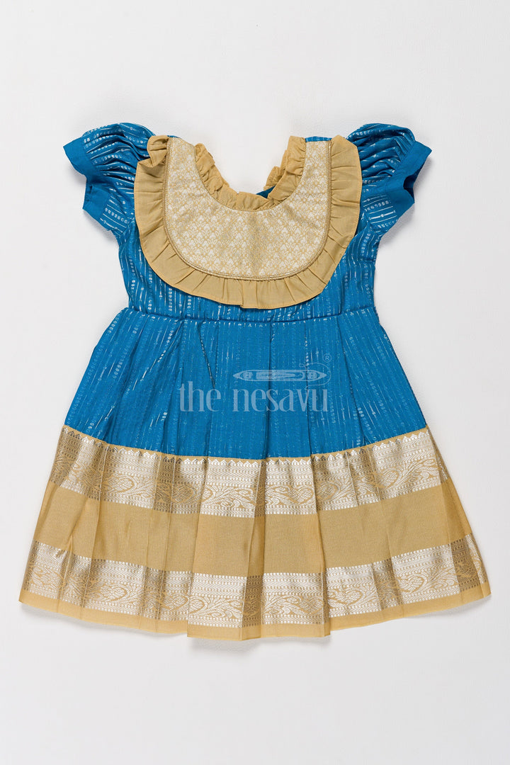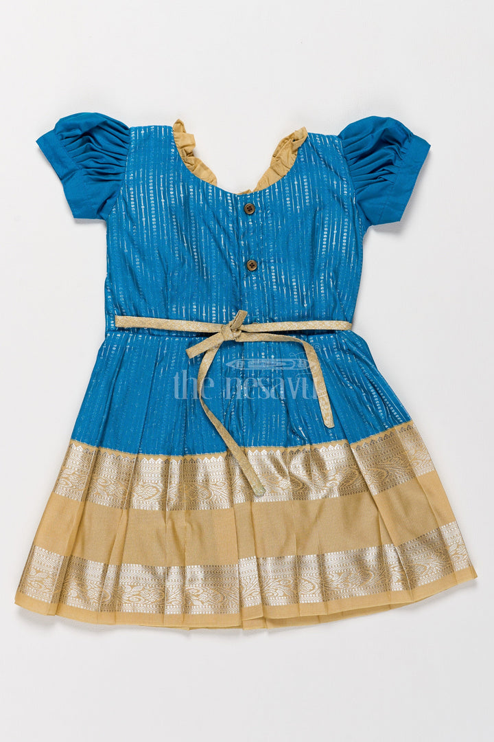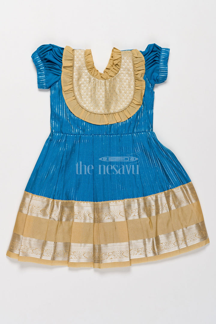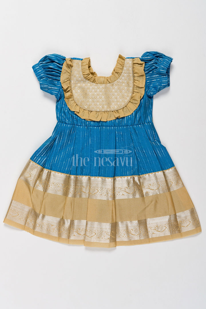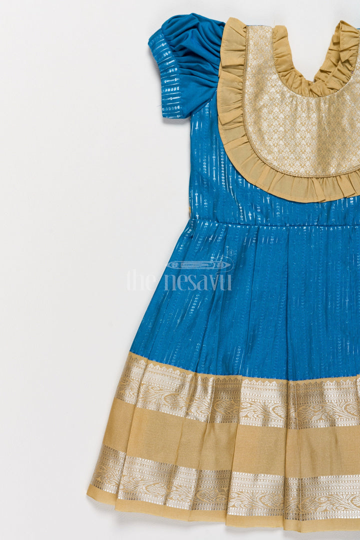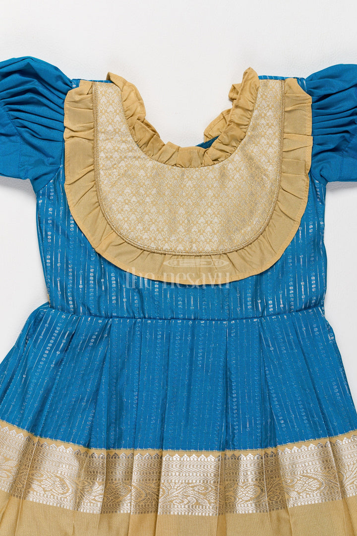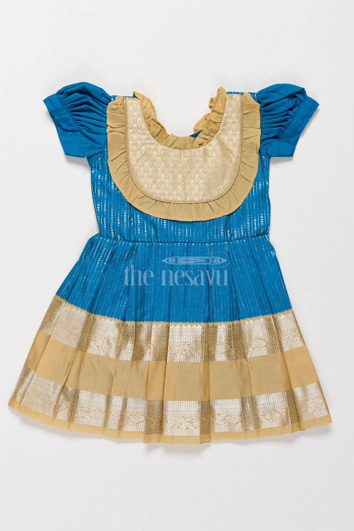 The Nesavu Girls Kanchi Silk Frock Exquisite Blue and Gold Kanchi Silk Frock for Girls’ Pongal Celebrations Nesavu Festive Blue Gold Kanchi Silk Frock Girls Pongal Traditions Nesavu