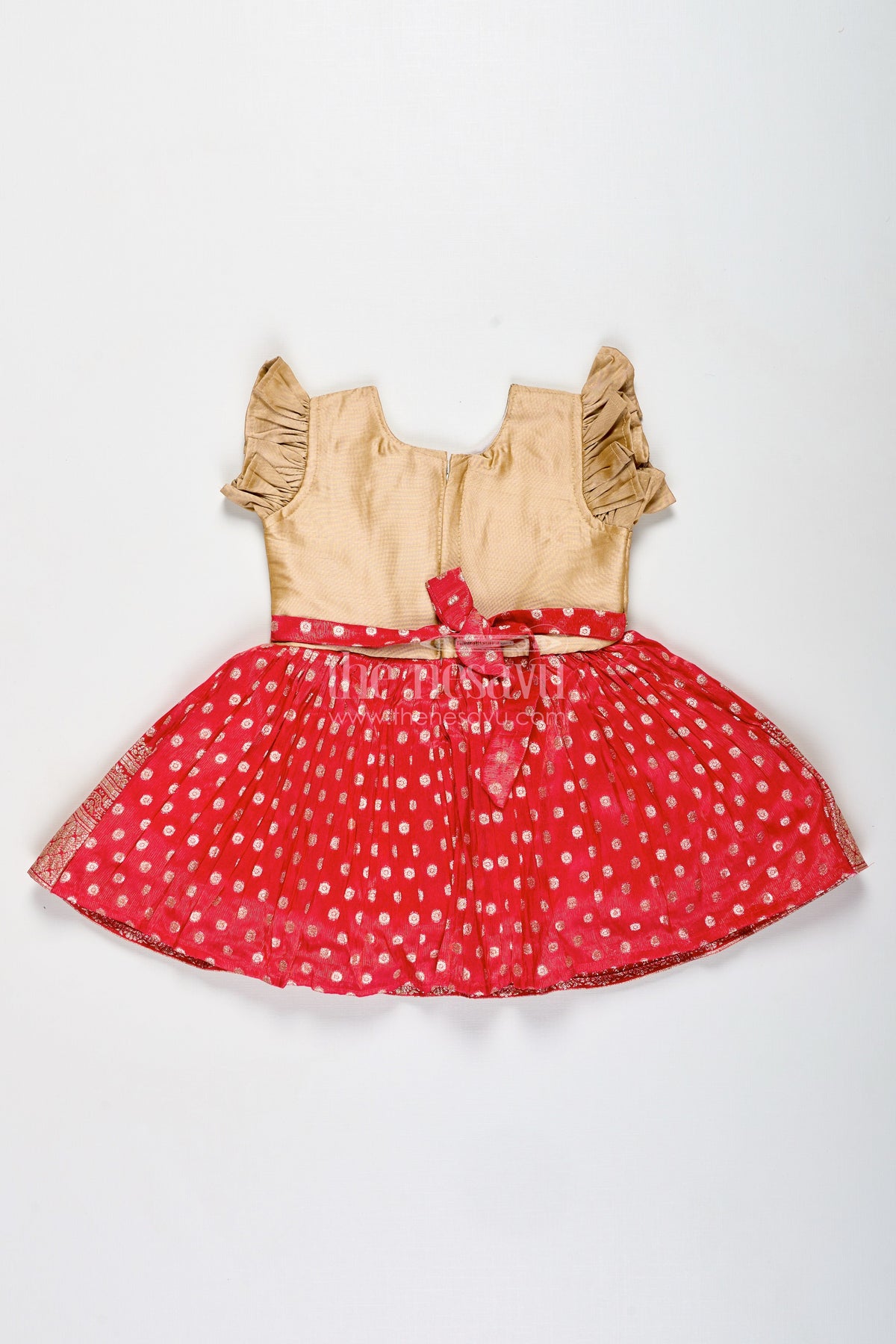 Infant Girl Red Silk Frock with Golden Tissue Flare and Puff Sleeves
