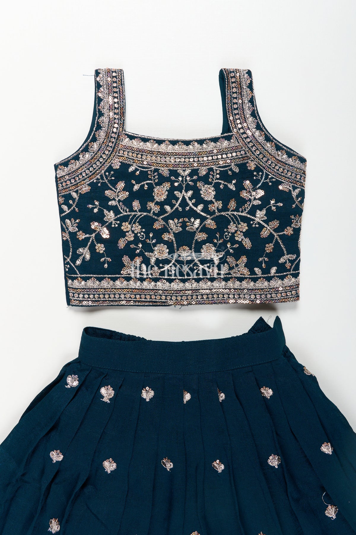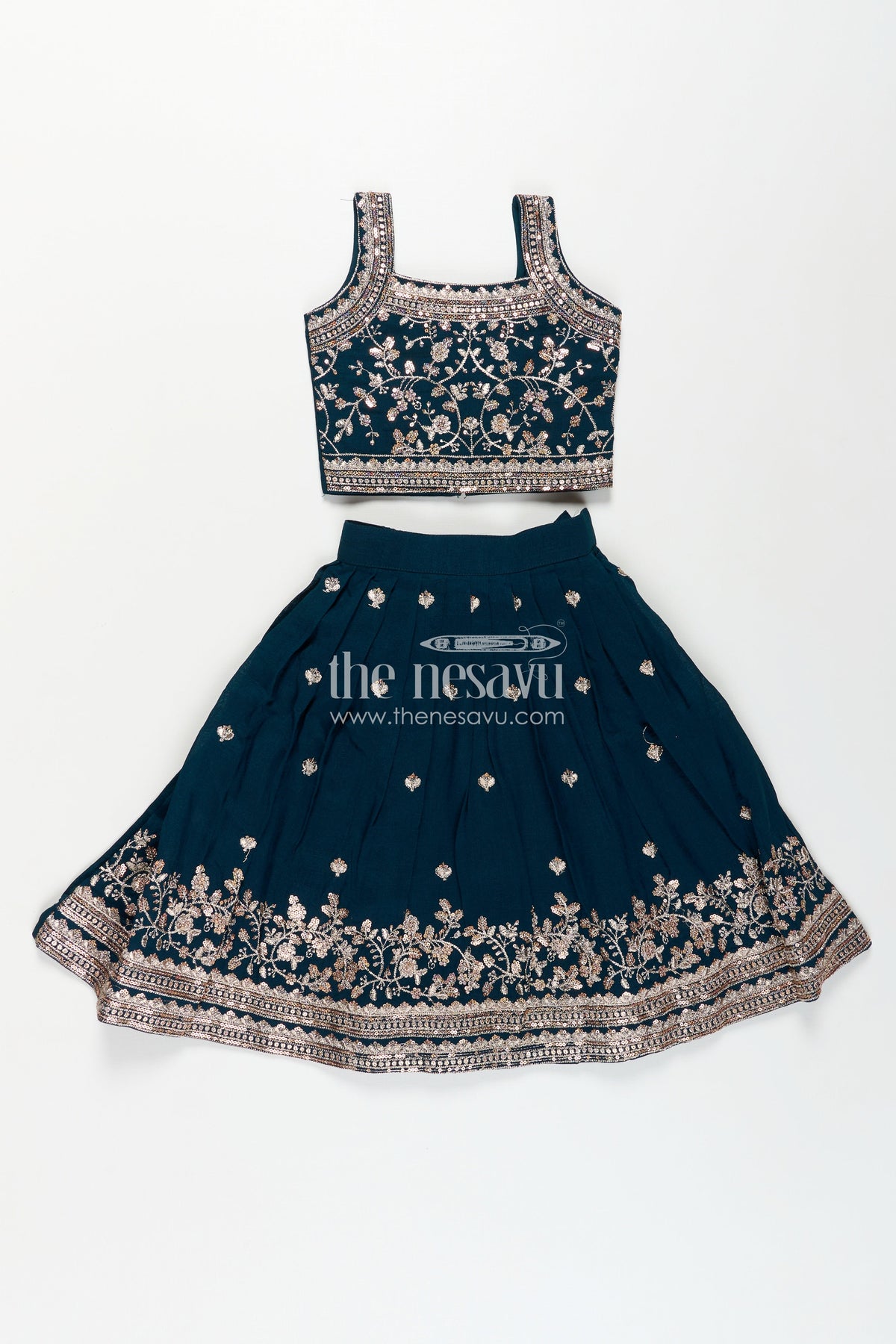 Dresses for wedding function are redefined in this striking deep green Chinon silk lehenga choli. The beautifully designed blouse features gold threadwork embroidery and sequins that create a regal, eye-catching look. The coordinating flared lehenga has a wide embroidered hem with shimmering motifs scattered throughout. A sheer matching dupatta with gold border enhances the richness of this festive ensemble. Ideal for weddings, engagements, and traditional events, this set brings sophistication and celebration-ready flair to your little girl's wardrobe.