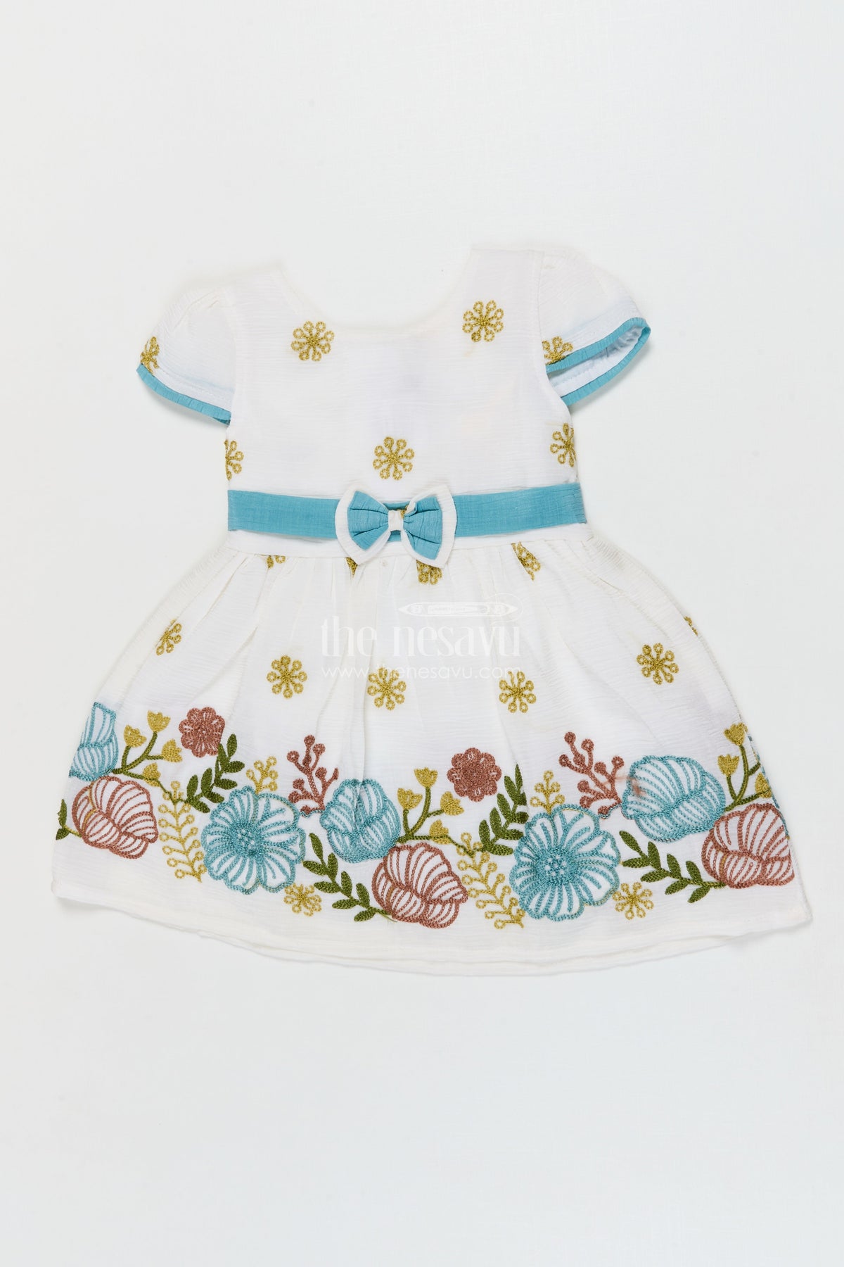 - Design: Floral embroidery, bow accent, pleated skirt