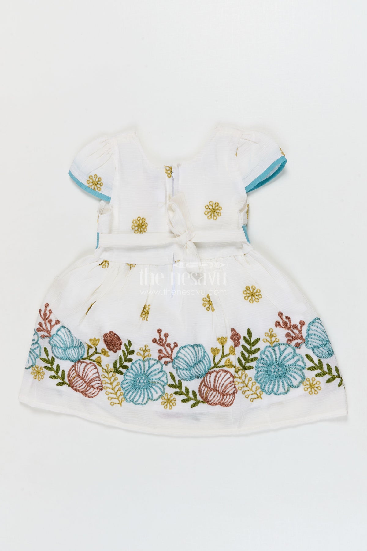 - Features full floral thread embroidery across the skirt for an artisanal feel