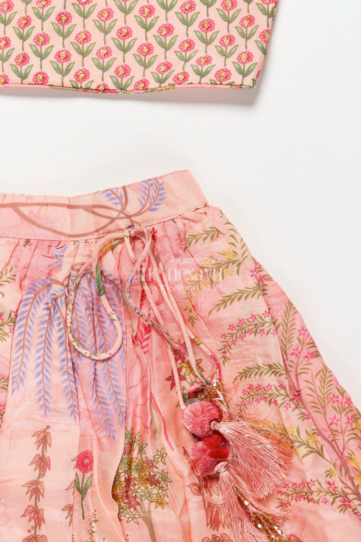 Design: Digital floral and nature print, flared lehenga, tassel tie-up