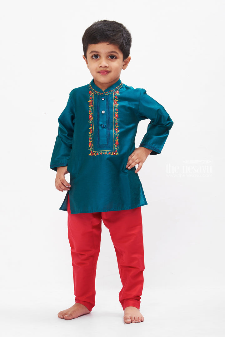 This Boys' Majestic Teal Kurta with Vibrant Pink Pants Set is a true celebration of color and tradition. The teal kurta is beautifully accented with intricate embroidery around the neckline and placket, providing a regal touch to the ensemble. The vibrant pink pants add a playful contrast, making it a striking outfit for any festive occasion. It's a blend of comfort, style, and tradition that will make your boy stand out in the crowd.
