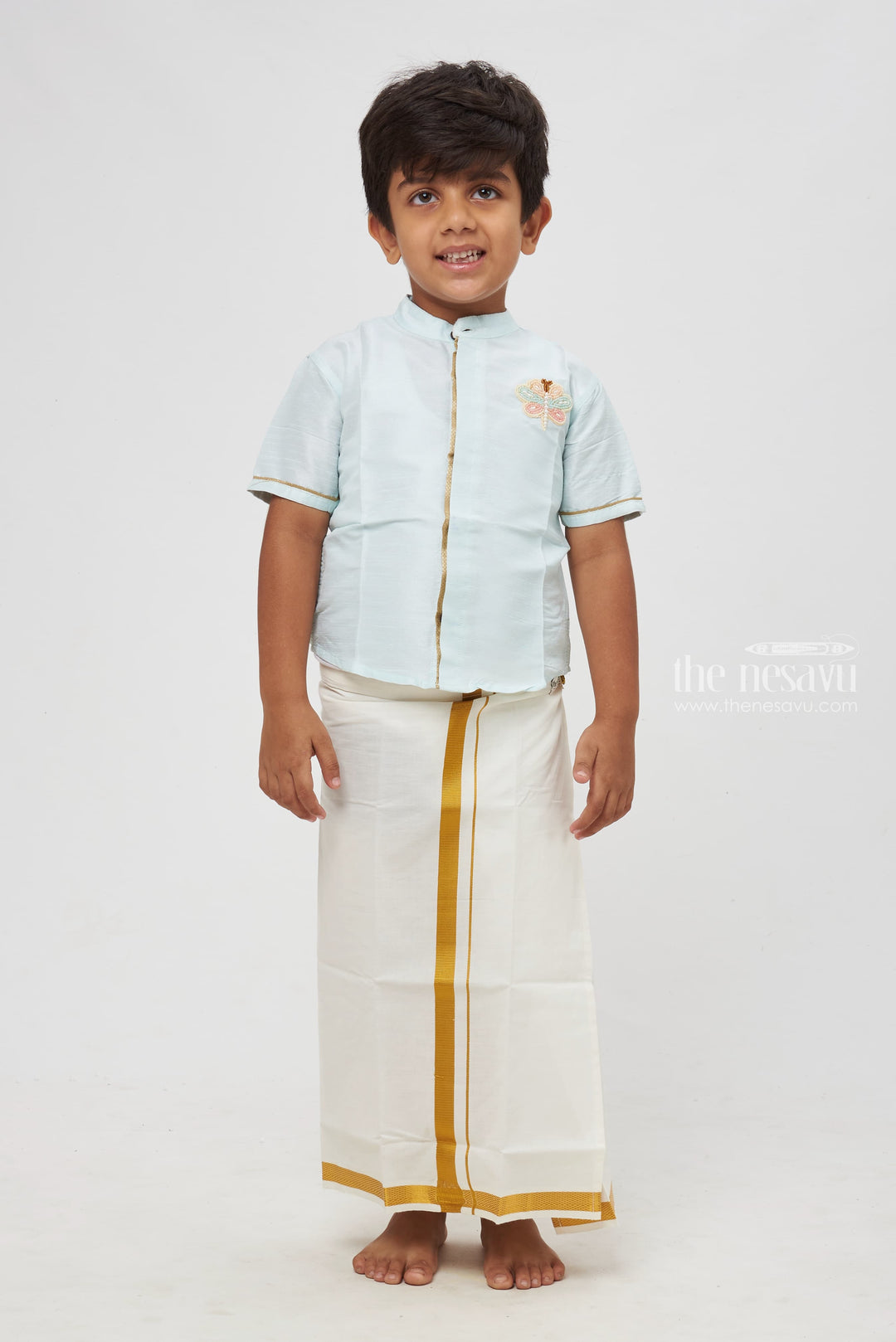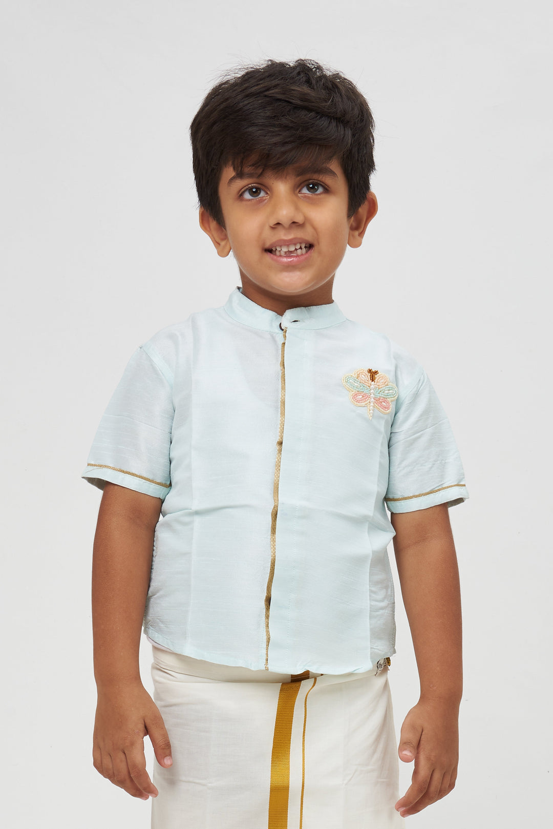 Boys Premium Ice Blue Silk Shirttraditional Festive Wear with Embellished Butterfly Patch