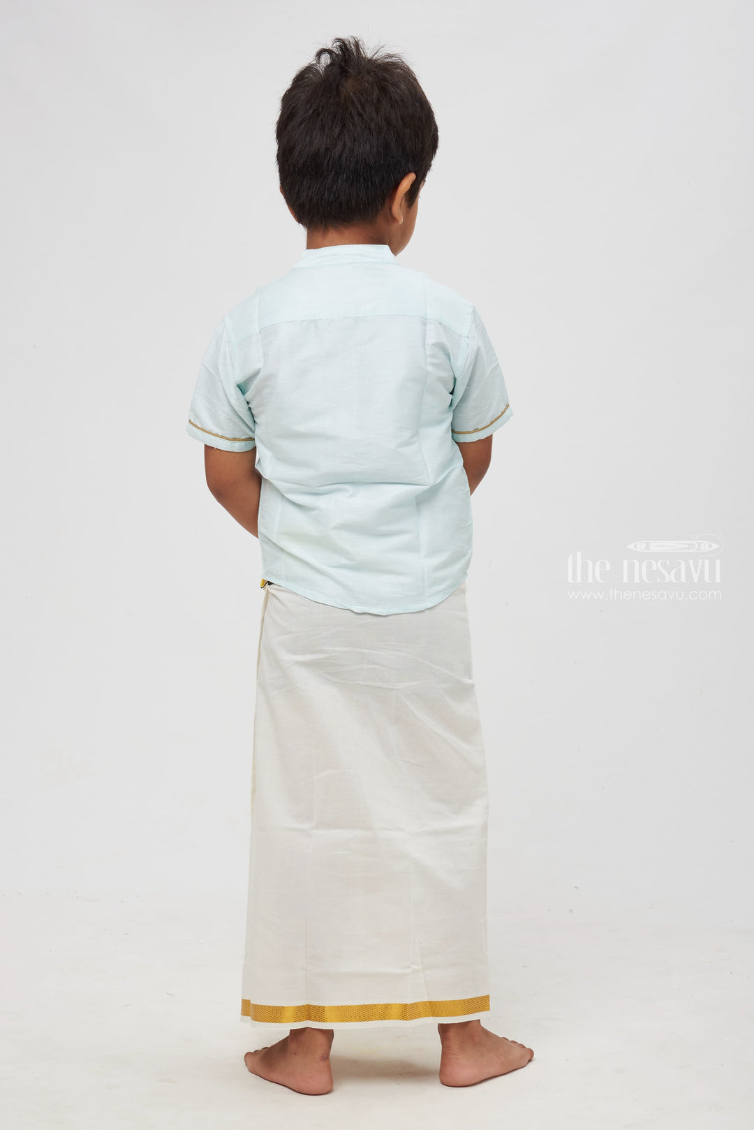 The Nesavu's boys' collection is graced with the addition of the Premium Ice Blue Silk Shirt, a perfect blend of traditional elegance and whimsical charm. This shirt, ideal for festive occasions, features a stunning ice blue hue, providing a fresh and serene look. The centerpiece of the design is the embellished butterfly patch, which adds a playful yet sophisticated touch. The premium silk material ensures both luxury and comfort, making it a great choice for celebrations, cultural events, and family gatherings.Specifications: